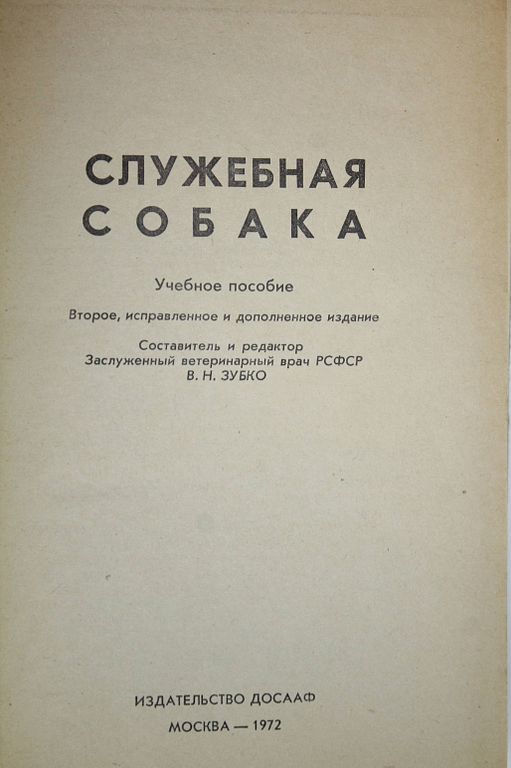 Служебная собака. Учебное пособие. Сост. и ред. В.Н. Зубко. М.: ДОСААФ. 1972г. 352 с., ил. В книге обобщен многолетний опыт разведения, выращивания, содержания, кормления и сбережения служебных собак, их дрессировки и тренировки. Даются советы по методике дрессировки служебных собак и подготовке специалистов служебного собаководства. При составлении книги авторы учитывали требования программы по подготовке квалифицированных специалистов служебного собаководства, и она может служить учебным пособием. Много полезного найдут в книге и собаководы-любители. Твердый переплет. Обычный формат. Хорошее состояние.