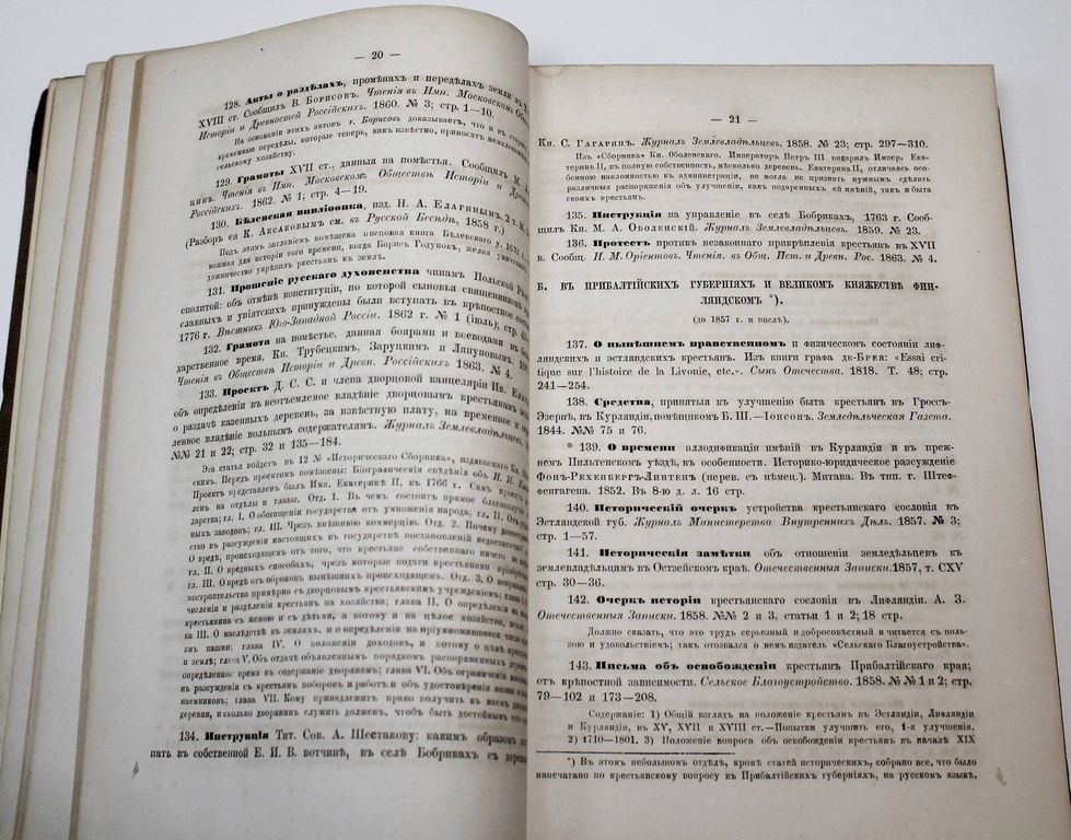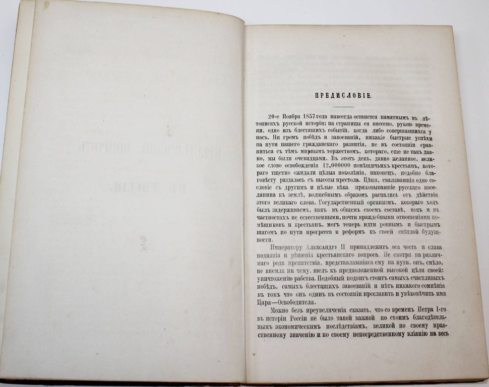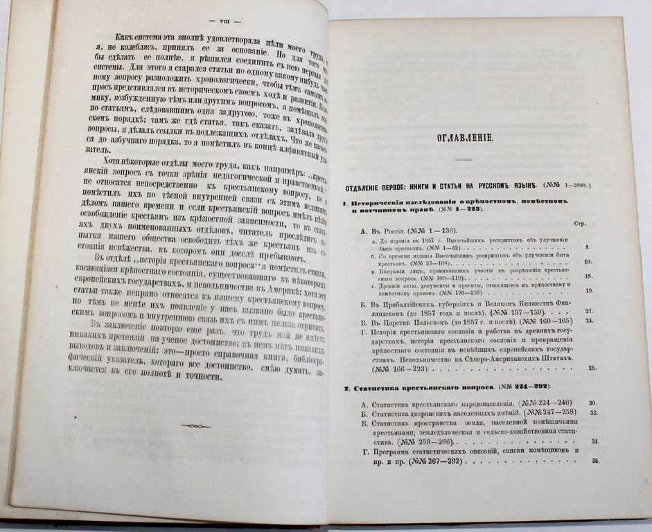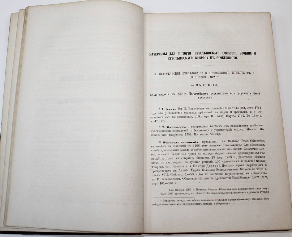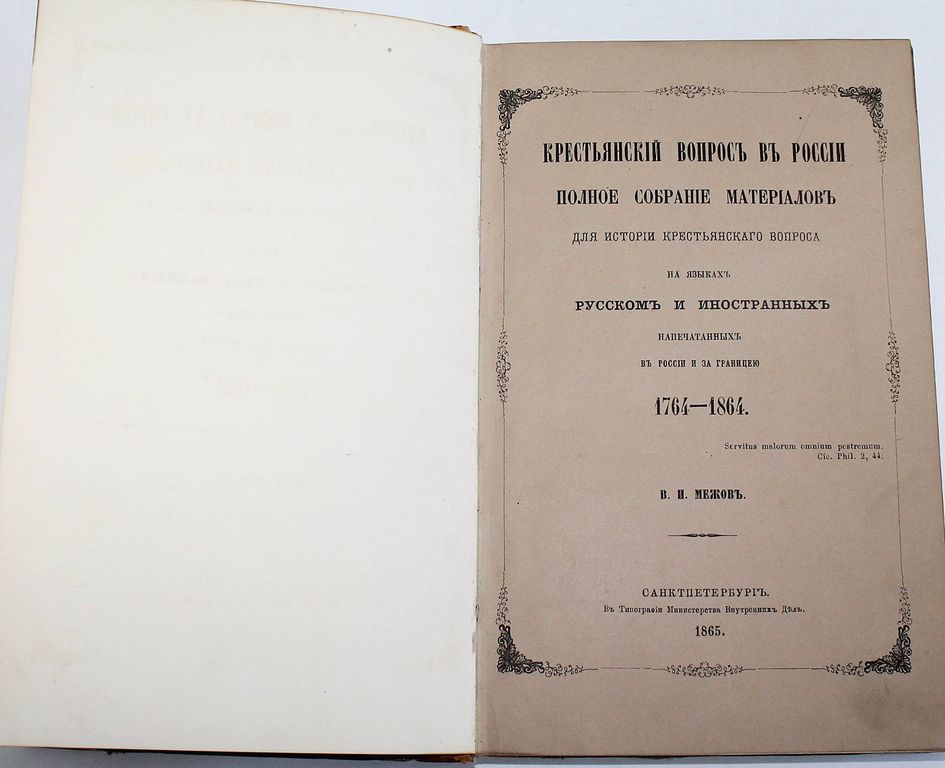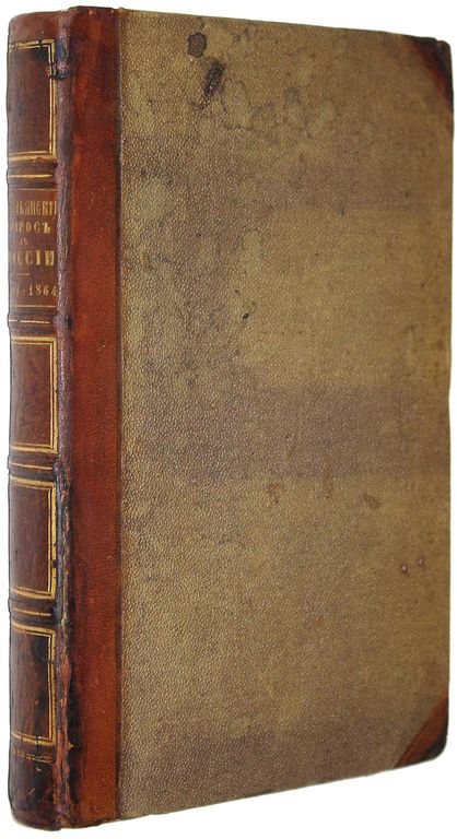 Межов В.И. Крестьянский вопрос в России. Полное собрание материалов для истории крестьянского вопроса на языках русском и иностранных, напечатанных в России и за границею 1764 – 1864. СПб.: В Типографии Министерства Внутренних Дел, 1865. – [2], VIII, [6], 422 с. Полукожаный переплет с бинтами и золотым тиснением на корешке, накатной узор на обрезах. Издательские обложки сохранены. Энциклопедический формат, 26х17 см. Владимир Измайлович Межов (1830 - 1894) - русский библиограф. Его библиографические труды насчитывают более ста томов. В каталоге описаны исторические исследования о крепостном, поместном и вотчинном праве; статистика крестьянского вопроса; работы по вопросу о свободном (наемном) и обязательном (барщинском) труде, о разных видах владения и пользования землей и т.д. В конце книги помещены алфавитные указатели к русской и иностранной частям каталога. За написание этой книги Межов был награжден Императорской денежной премией. Хорошее состояние. Потертости и небольшие загрязнения переплета. Без титульного листа (?).