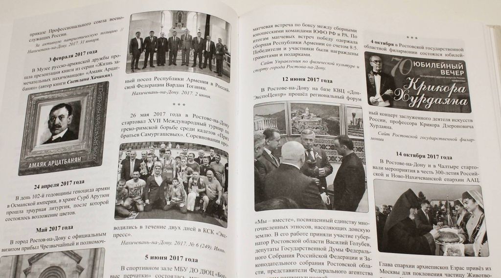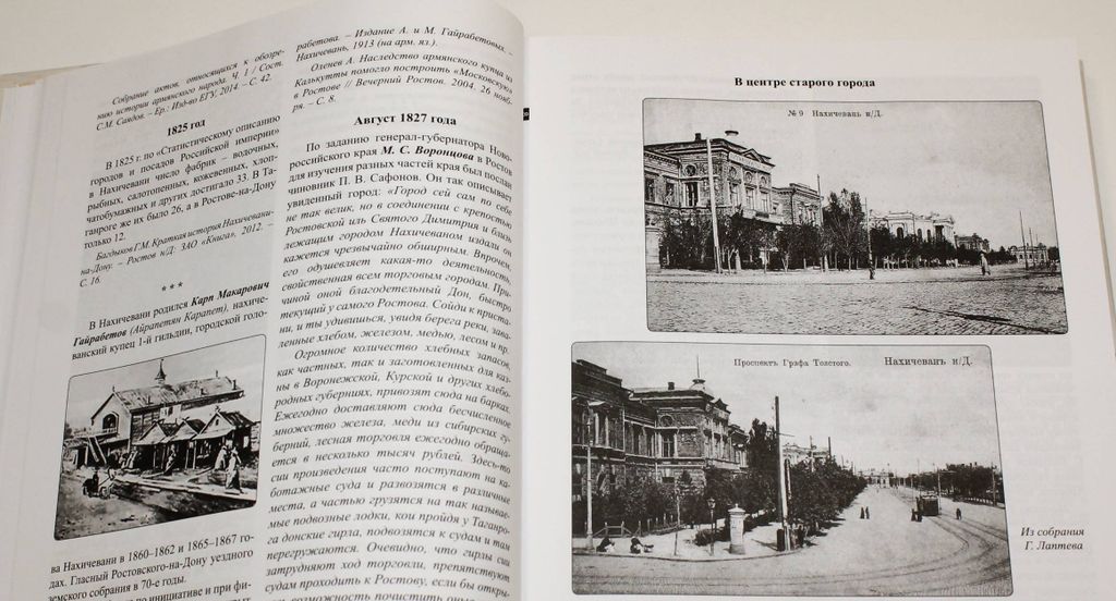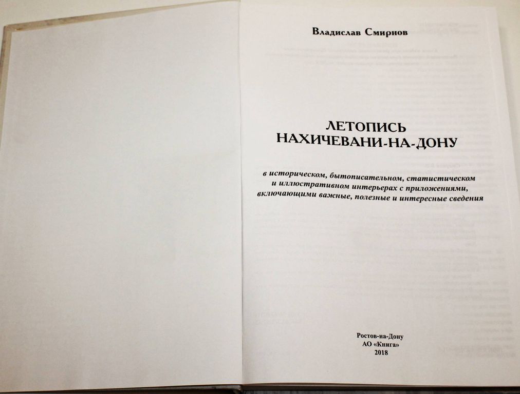Смирнов В. Летопись Нахичевани-на-Дону в историческом, бытописательском, статистическом и иллюстративном интерьерах с приложениями, включающими важные, полезные и интересные сведения. 2-е изд.,перераб. и доп. Ростов-на-Дону: Книга. 2018. 456с..ил. Хронологическая энциклопедия включает в себя портретную галерею выдающихся, известных деятелей армянского народа, а также русских писателей, внесших вклад в развитие русско-армянских дружественных связей, информационно-справочные сведения о важнейших свершениях и событиях, документы и статистику по истории, экономике, науке, культуре Нахичевани-на-Дону. Особый колорит книге придают бытописательские, этнографические наблюдения, впечатления исследователей, путешественников, посещавших этот замечательный город в разное время, а также воспоминания жителей старой Нахичевани. Книга содержит богатый иллюстративный материал, в том числе и редкие фотографии. Издание представляет большой интерес для историков, краеведов, журналистов и для всех, кто интересуется прошлой и настоящей жизнью армян на Дону. Тираж 500 экз. Твердый переплет. Энциклопедический формат. Отличное состояние.