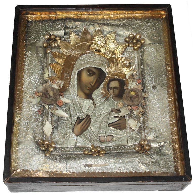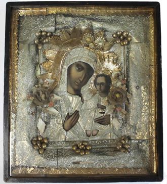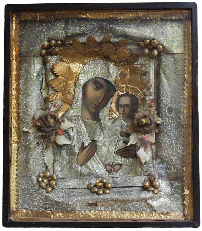 Икона `Богоматерь Смоленская`. Россия. Конец XIX-нач. ХХ вв. Дерево, масло, оклад из фольги с тиснением. Деревянный киот, стекло. Размер: 35 х 27 см. Размер киота: 53х46,5 см. В хорошей сохранности.