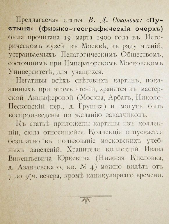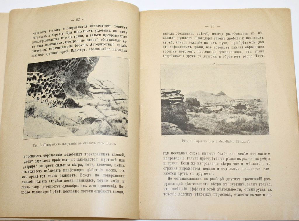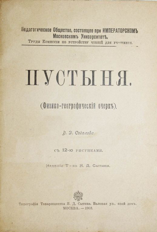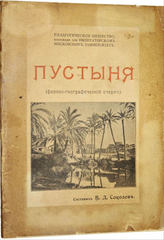 Соколов В.Д. Пустыня (Физико-географический очерк). С 12-ю рисунками. М.: Тип. Тов-ва И.Д.Сытина, 1903. – 44 с., ил. В издательской иллюстрированной обложке. Обычный формат, 20х14.5 см. Автор книги Владимир Дмитриевич Соколов (1855 - 1917) - русский учёный, геолог и гидрогеолог. Прижизненное издание. Хорошее состояние. Реставрация обложки.
