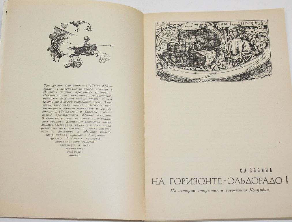 Созина С.А. На горизонте- Эльдорадо! Из истории открытия и завоевания Колумбии. М.: Мысль. 1972г. 198с., 4л.ил. Три долгих столетия - с XVI по XIX вв. жила на американской земле легенда о Золотой стране, правитель которой Эльдорадо от испанского `позолоченный`, осыпался золотым песком, чтобы затем смыть его в водах священного озера. В поисках Эльдорадо многие поколения конкистадоров, путешественников и ученых открыли, обследовали и описали необозримые пространства Южной Америки. В книге на материалах старинных испанских хроник и других исторических документов воссоздана яркая история этих увлекательных поисков, а также рассказано о культуре и обычаях индейского народа муисков в Колумбии, щедрая фантазия которых породила эту существовавшую в действительности церемонию. Мягкий переплет. Обычный формат. Хорошее состояние.