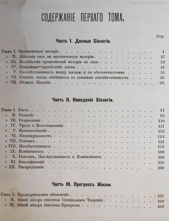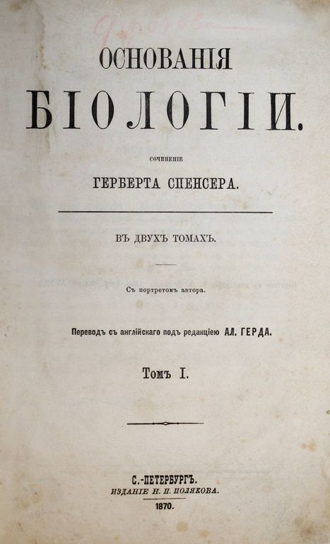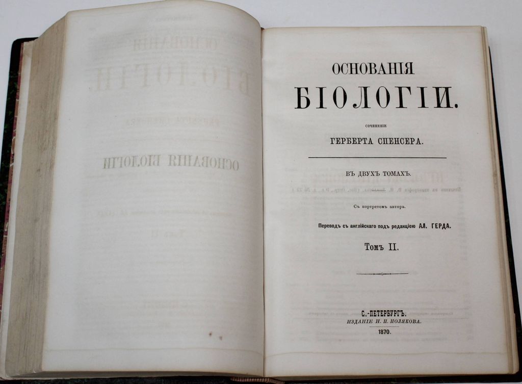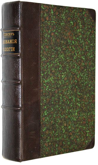 Спенсер Г. Основания биологии. В 2-х томах. Пер. с англ. под ред. Ал. Герда. СПб.: Изд. Н.П.Полякова, 1870. – [10], 370 с.; [10], 440 с. В современном полукожаном переплете. Увеличенный формат, 24х16.5 см. Герберт Спенсер (1820 - 1903) - английский философ и социолог, один из родоначальников эволюционизма, идеи которого пользовались большой популярностью в конце XIX века, основатель органической школы в социологии; идеолог либерализма. Хорошее состояние. Незначительные загрязнения отдельных страниц.