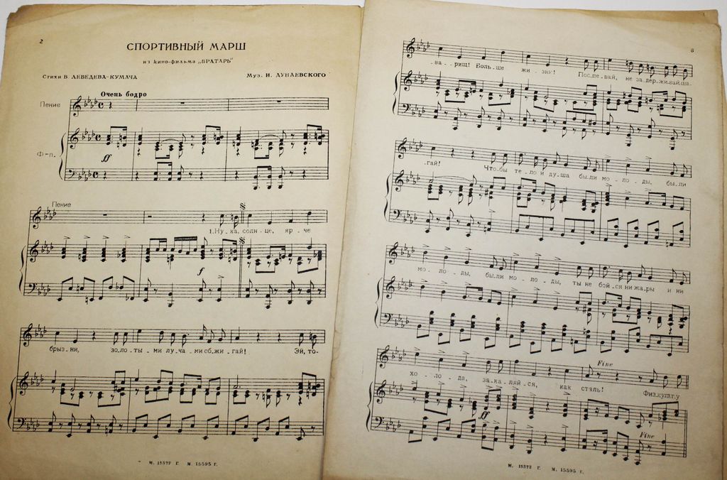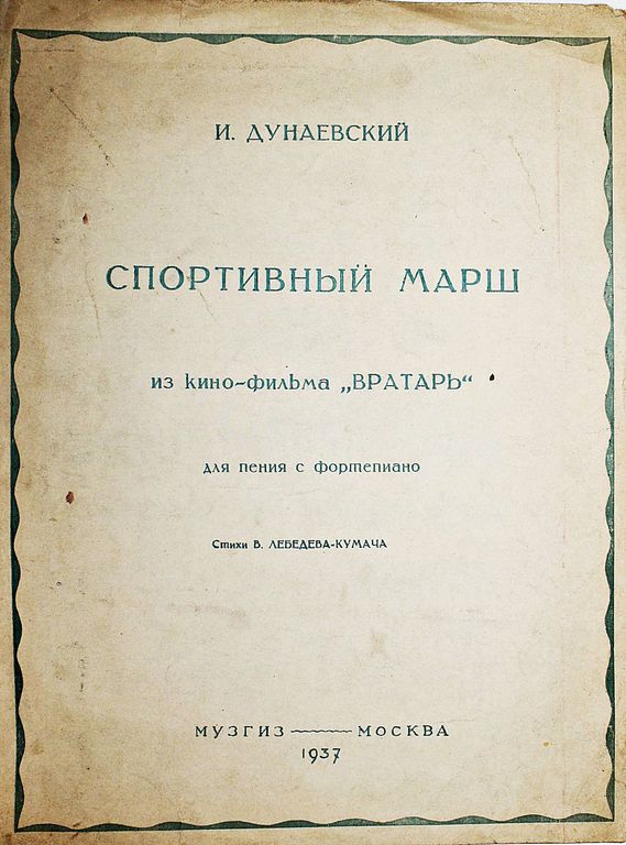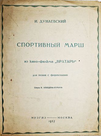 Дунаевский И. Спортивный марш. Из кино-фильма `Вратарь`. Для пения с фортепиано. Стихи В.Лебедева-Кумача. М.: Музгиз, 1937. 250 руб. В корзину Описание Описание Дунаевский И. Спортивный марш. Из кино-фильма `Вратарь`. Для пения с фортепиано. Стихи В.Лебедева-Кумача. М.: Музгиз, 1937. – 6 с., нот. Мягкая обложка. Энциклопедический формат, 30.5х23 см. Хорошее состояние.