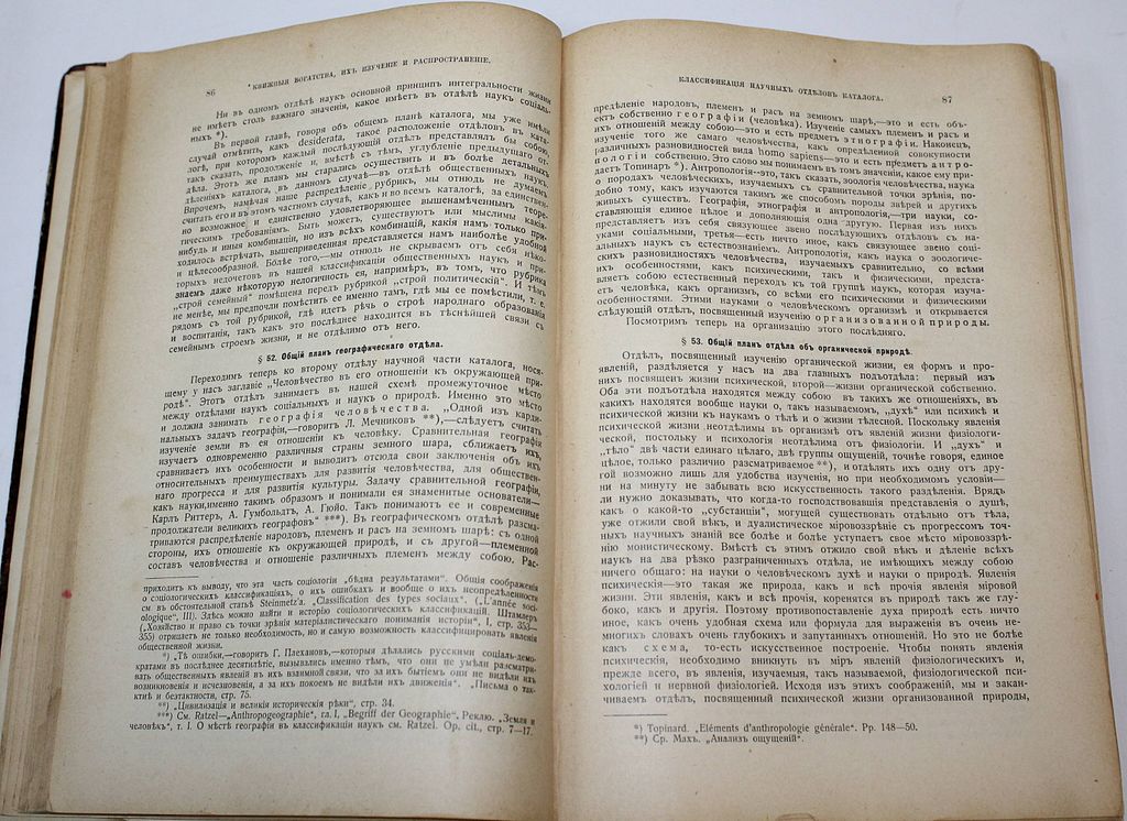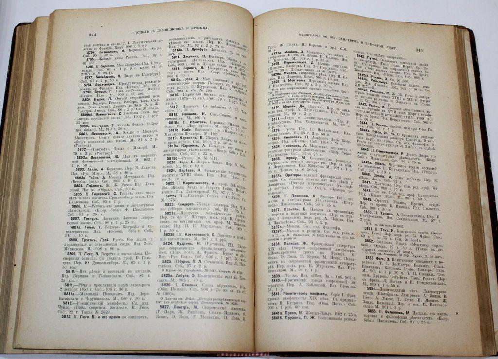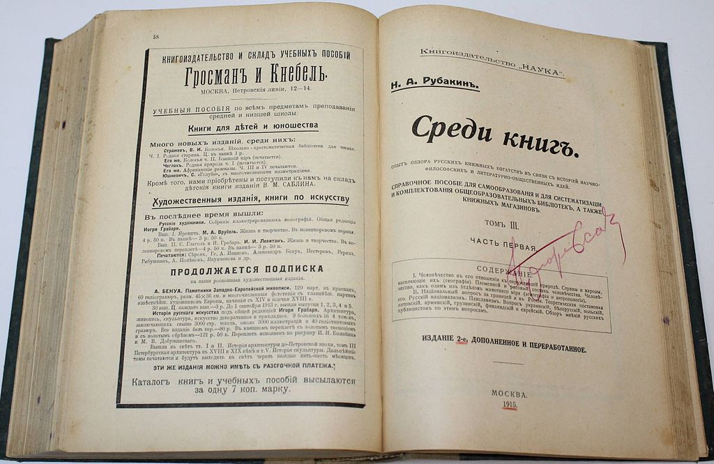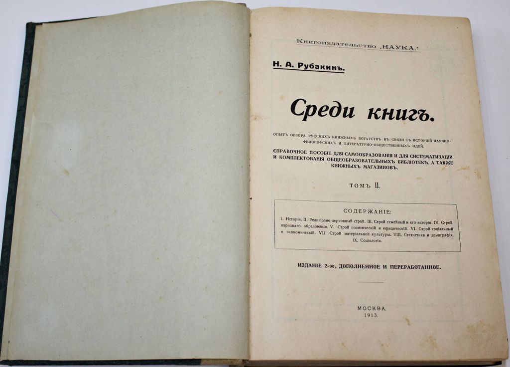 Рубакин Н. А. Среди книг. В 3-х томах. Опыт обзора русских книжных богатств в связи с историей научно-философских и литературно-общественных идей. Изд. 2-е доп. М.: Книгоиздательство `Наука`, 1911-1915. В двух составных переплетах, тома в подборе. Энциклопедический формат, 26.5х19 см. Т.1: XXIV, [2], 192, 424, [8], 80 с.; Т. 2: XVI, 930, [4], 58 с.; Т.3.: VIII, 200, 10 с. Рубакин Николай Александрович (1862 - 1946) - российский книговед, библиограф и писатель. Собрал две большие библиотеки (около 200 тыс. томов), которые передал в дар народу. Наибольшую известность приобрел фундаментальный труд Рубакина `Среди книг`, подобного которому не было в мировой библиографии. Это издание имеет большое значение и для других наук, являясь смелой новаторской работой междисциплинарного характера. Издание представляет собой каталог книг и их сравнительный обзор по особой системе. В основе этого обзора не только классификация явлений и областей жизни, но и история научно-философских и литературно-общественных идей. Целью создания подобного справочника стало желание дать библиотекарям, книгопродавцам и обычным читателям возможность ориентироваться в русских книжных богатствах. Хорошее состояние. Незначительные потертости переплетов, экслибрисы.