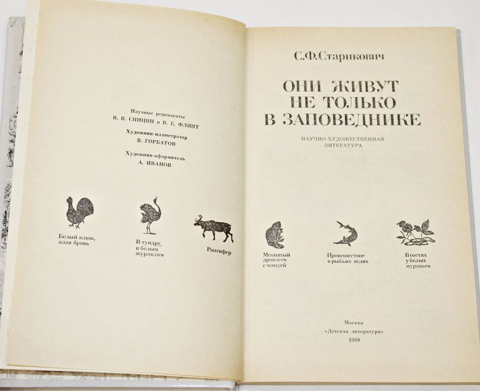 Старикович С.Ф. Они живут не только в заповеднике. Худ. В.Горбатов. М.: Детская литература. 1988г. 192с., ил. Автор избрал героями своих очерков мало известные читателям виды животных - стерха, северного оленя, глухаря, бобра, севрюгу. Интерес автора ко всему, что он сам видел, побывав в заповедниках нашей страны, наблюдая за трудной работой их сотрудников, побудил его к тому, чтобы рассказать ребятам о сложности экологических связей, о необходимости беречь всевозможную живность. Твердый переплет. Обычный формат. Очень хорошее состояние.
