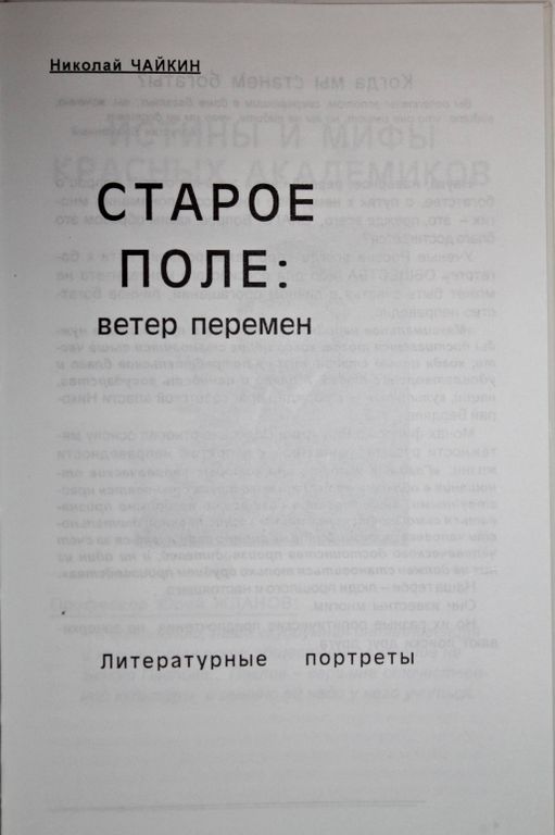 Чайкин Н. Старое поле: ветер перемен. Литературные портреты. Ростов-на-Дону: ИД Птица. 2009. 304с.,ил. Герои книги-известны многим. Их объединяет одно: мысли как обустроить Россию, что надо делать , чтобы она процветала, стала богатой. Но кто их слушает? Вот в чем вопрос. Тираж 2000 экз. Твердый переплет. Обычный формат. Отличное состояние.
