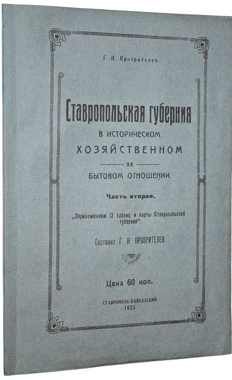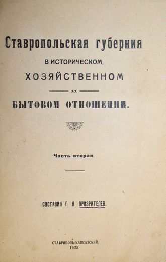 Прозрителев Г.Н. Ставропольская губерния в историческом, хозяйственном и бытовом отношении. Часть вторая. [и единств.]. Ставрополь-Кавказский, 1925. – 66 с., 1 л. карт. Мягкая обложка. Энциклопедический формат, 25.5х17.5 см. Григорий Николаевич Прозрителев (1849 - 1933) - русский учёный, краевед, общественный деятель. В 1920-1927 гг. заведовал музеем Северного Кавказа в г. Ставрополе, одновременно являясь председателем Ставропольской этнолого-археологической комиссии. Его обширное творческое наследие насчитывает более 200 работ по истории г. Ставрополя, Ставропольской губернии, Северного Кавказа. Одним из наиболее значимыми из них он считал исследование `Ставропольская губерния в историческом, хозяйственном и бытовом отношениях`. Редкость! Хорошее состояние. Обложка восстановлена с оригинала, тит. лист `мытый`.