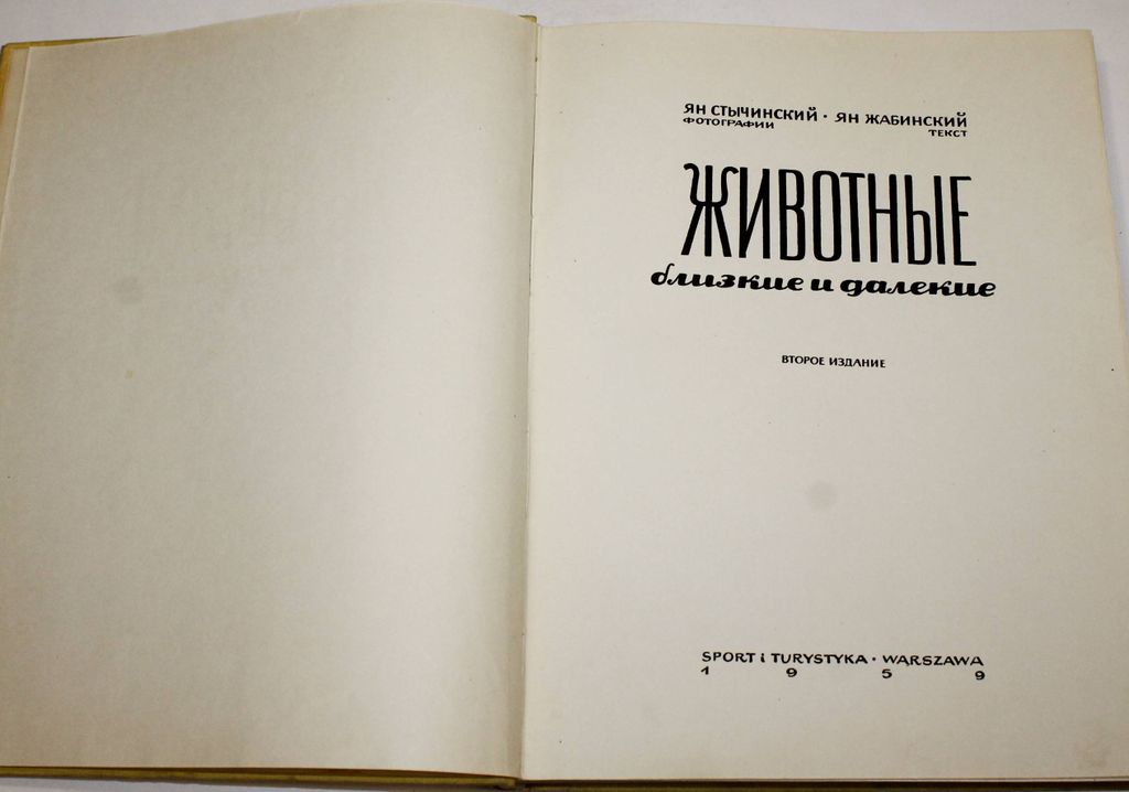 Ян Стычинский, Ян Жабинский. Животные близкие и далекие. Варшава: Спорт и туризм. 1959 г. 255 с.,ил. Книга содержит около 450 черно-белых фотографий птиц и животных (в основном фотографии увеличенного формата), сделанных известным польским создателем художественной фотографии Яном Стычинским. В начале книги - пояснительный текст с рисунками. Большинство фотографий имеют пояснительный текст. Имеется латинский указатель птиц и животных соответствующий каждой фотографии. Часть снимков сделана в цвете. Твердый переплет. Энциклопедический формат. Хорошее состояние.