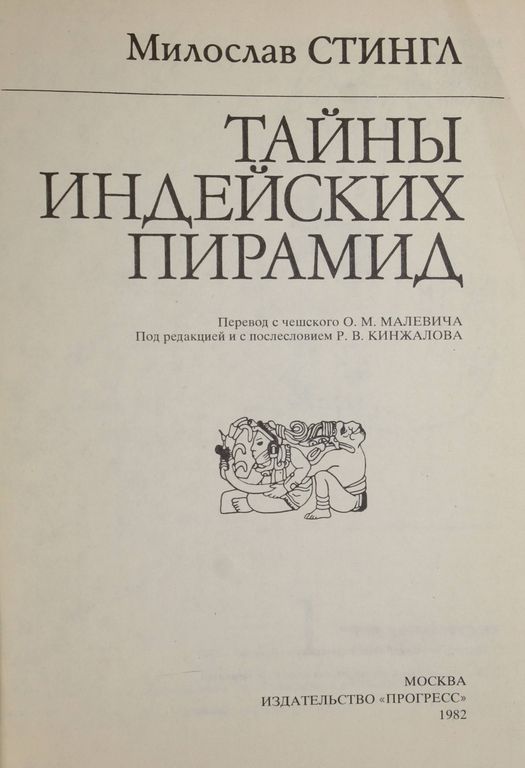 Стингл М. Тайны индейских пирамид. М.: Прогресс. 1982г. 248 с. В книге известный чешский исследователь рассказывает об истории самой блестящей культуры доколумбовой Америки, о городах и пирамидах майя . Книга содержит множество цветных и черно-белых фотографий древних сооружений майя, планов и схем. Твердый переплет. Увеличенный формат. Хорошее состояние.