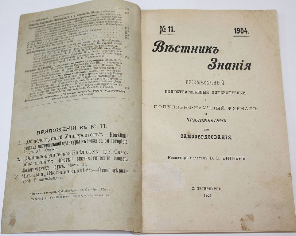 Вестник Знания. № 11 за 1904 год. Ежемесячный иллюстрированный литературный и популярно-научный журнал с приложениями для самообразования. Ред.- издатель В.В.Битнер. СПб.: Тип. Т-ва `Народная Польза`, 1904. – 200 с.. ил. Мягкая издательская обложка. Увеличенный формат, 24.5х15.5 см. Ежемесячный журнал `Вестник Знания` был основан в Санкт-Петербурге в 1902 году. Выходил до 1918 года; был возобновлён в 1925 году. В первом номере было заявлено, что редакция ставит своей целью `распространять знания как главный залог прогресса и благосостояния народа`. В.В. Битнеру удалось собрать вокруг журнала заинтересованных подписчиков, объединив их под девизом `Учиться и учить других`. Издатель с первого номера искал не просто читателей, но единомышленников и сподвижников в деле просвещения и образования. Хорошее состояние. Реставрация обложки, небольшие дефекты нескольких листов, `мытый` экземпляр.