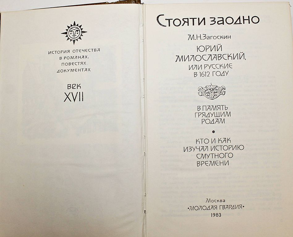 Стояти заодно. Серия: История Отечества в романах,повестях,документах Век 17-ый. Сборник. М.: Молодая гвардия. 1983г. 493с. Сборник `Стояти заодно` расскажет о драматических событиях, происходивших в Московском государстве в начале XVII столетия. Знакомство с историческим романом М.Н.Загоскина `Юрий Милославский, или Русские в 1612 году`, с письменными памятниками Смутного времени и исследованиями историков углубят представления о первой крестьянской войне в России, борьбе русского народа с иностранной интервенцией в то время. Твердый переплет. Обычный формат. Хорошее состояние.