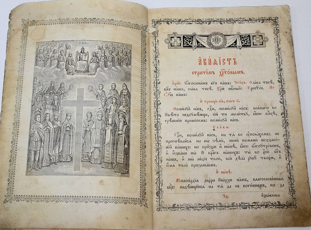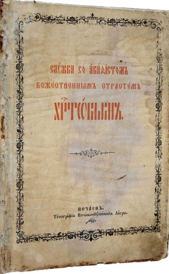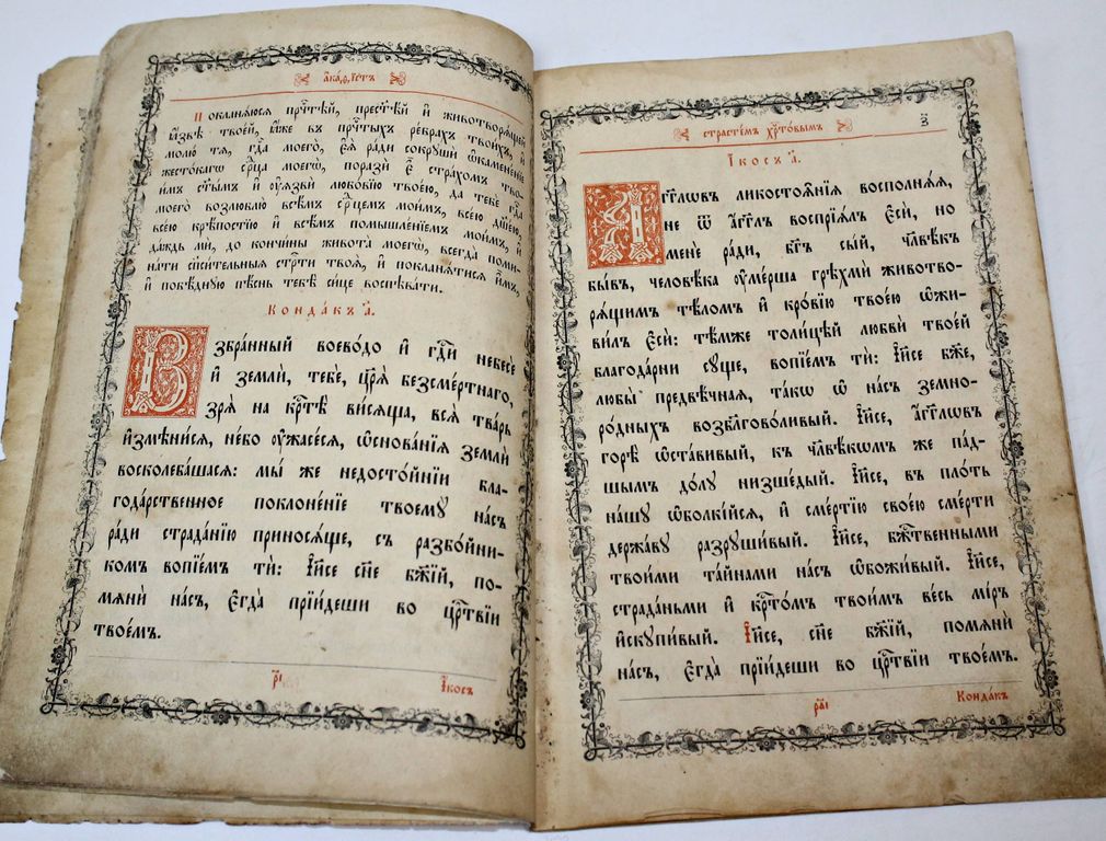 Служба с акафистом Божественным Страстям Христовым. Почаев: Тип. Почаево-Успенской Лавры, 1905. – [1], 22 л., ил. Мягкая издательская обложка. Печать в две краски. Текст в орнаментированных рамках, заставки, концовки, инициалы. Увеличенный формат, 23х16 см. Удовлетворительное состояние.