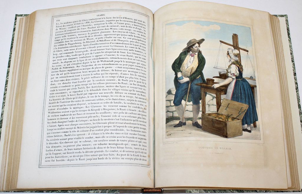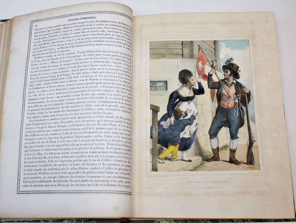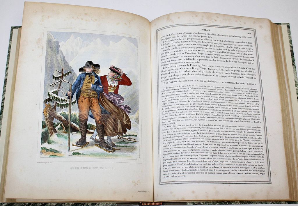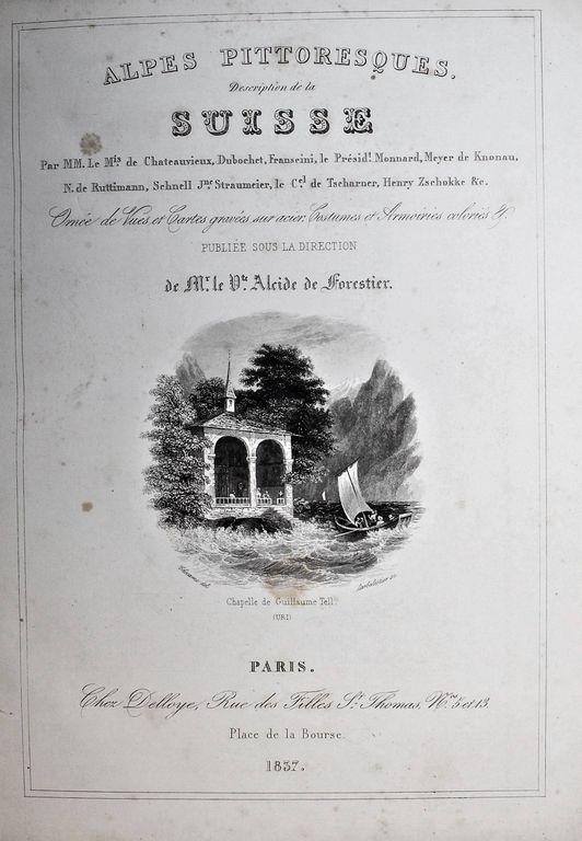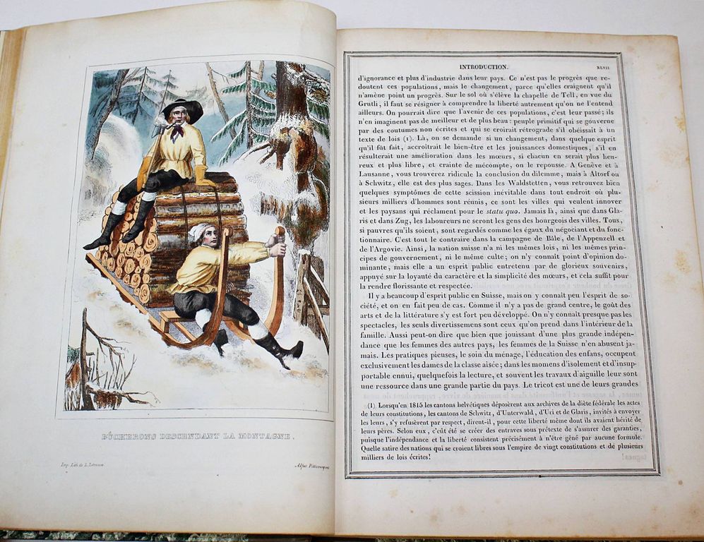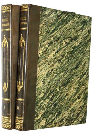 Живописные Альпы. Описание Швейцарии. В 2-х частях. [Alpes pittoresques. Description de la Suisse. На фр. яз.]. Коллективный труд под ред. Альсида де Форестье. Paris: Delloye, 1837-1838. – [2], LVI, 202, [2] с., 45 л. ил., 8 л. карт; [4], 262, [2] с., 48 л. ил., 15 л. карт. В двух полукожаных томах. Энциклопедический формат, 28х21.5 см. Фундаментальное иллюстрированное издание, посвящённое природе, истории и культуре Швейцарии. Книга создавалась как коллективный труд ведущих швейцарских историков, писателей и учёных первой половины XIX века и задумывалась в духе романтизма — как соединение научного знания и эстетического восприятия ландшафта. Издание включает виды Альп, городов, озёр, архитектурных памятников, а также сцены народной жизни, костюмы и исторические сюжеты. Иллюстративный материал выполнен в технике гравюры (сталь, медь), часто с живописной трактовкой света и атмосферы. Более 100 гравюр и карт на отдельных листах! Хорошее состояние. Фоксинги.