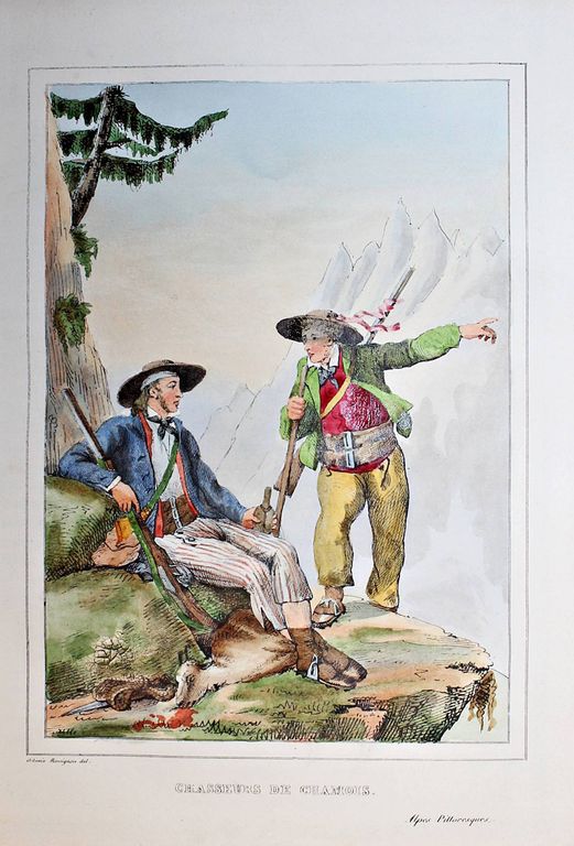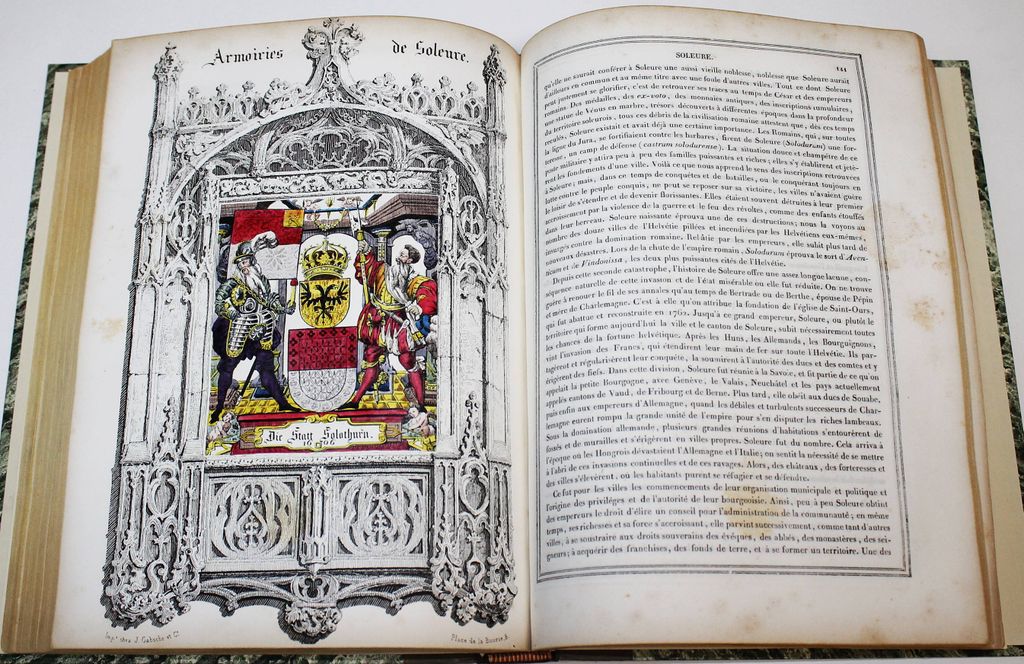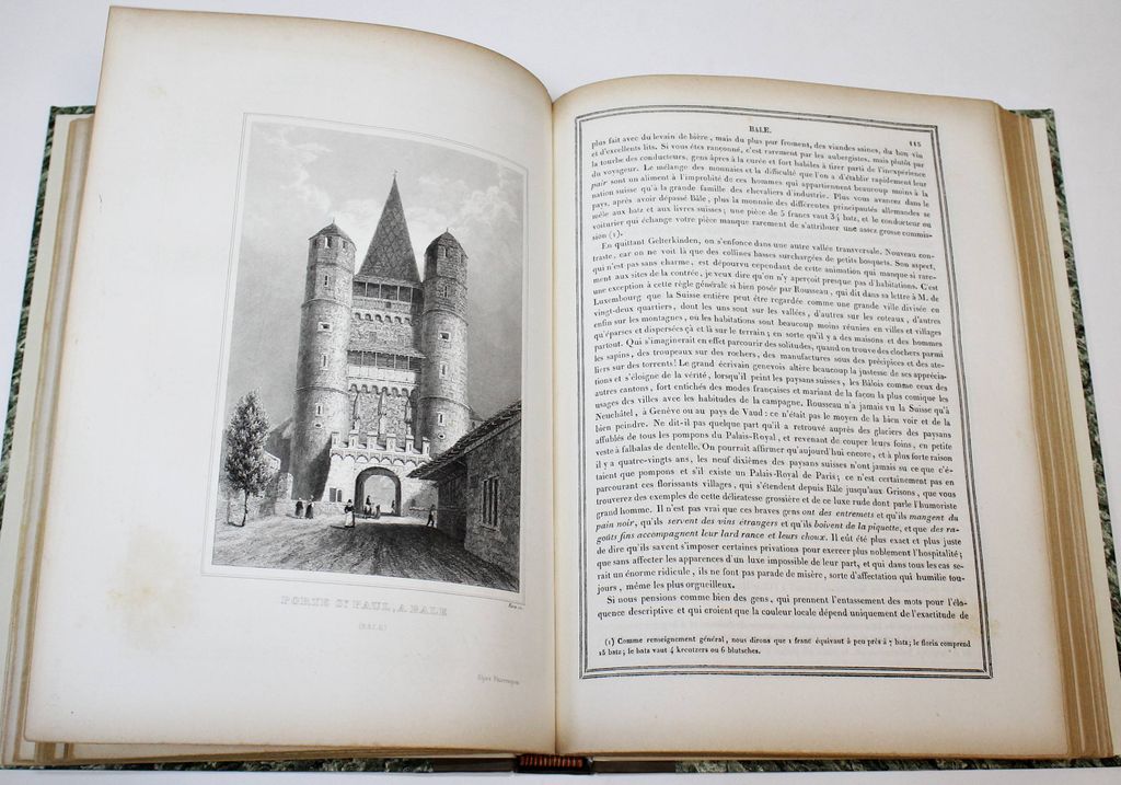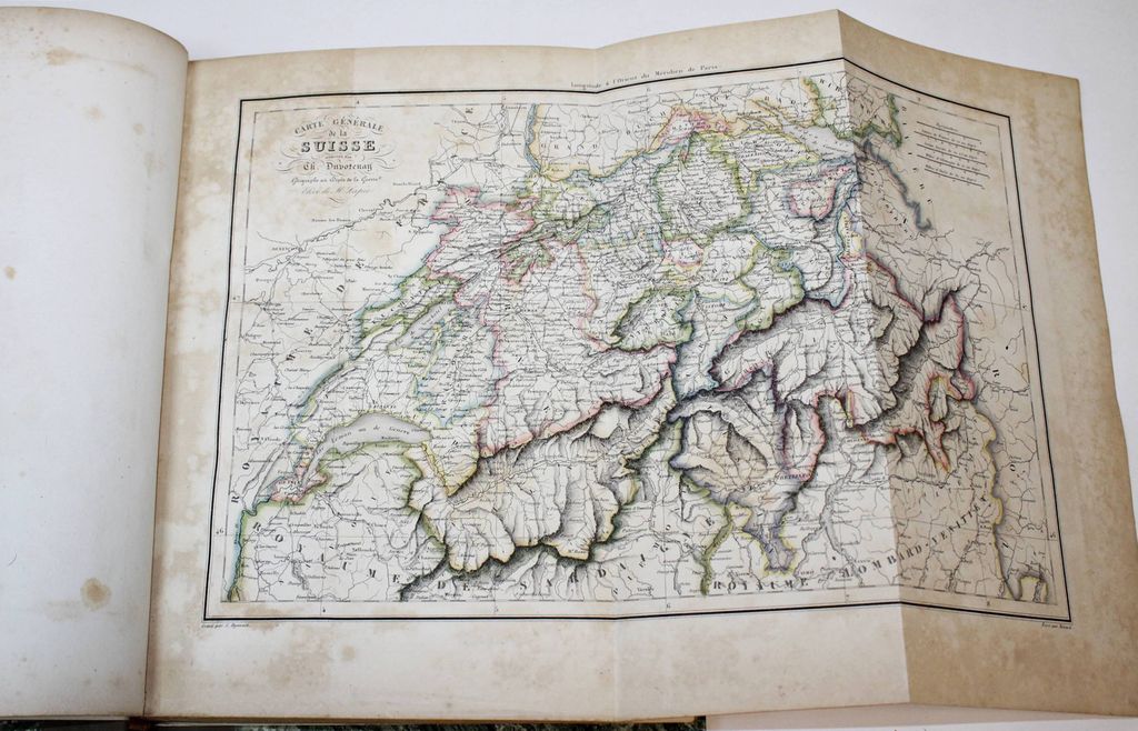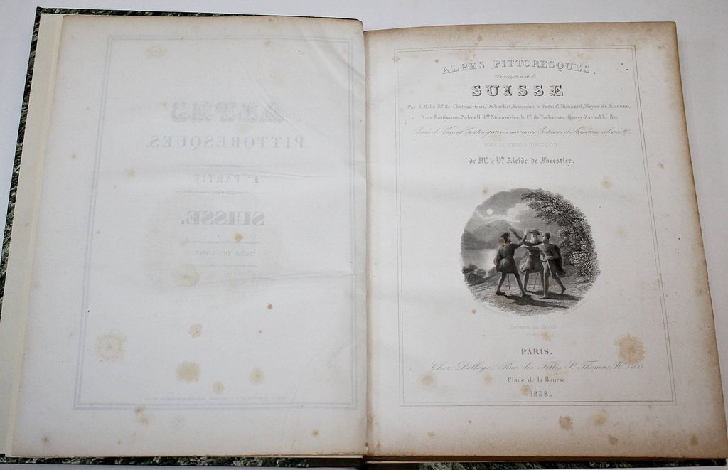 Живописные Альпы. Описание Швейцарии. В 2-х частях. [Alpes pittoresques. Description de la Suisse. На фр. яз.]. Коллективный труд под ред. Альсида де Форестье. Paris: Delloye, 1837-1838. – [2], LVI, 202, [2] с., 45 л. ил., 8 л. карт; [4], 262, [2] с., 48 л. ил., 15 л. карт. В двух полукожаных томах. Энциклопедический формат, 28х21.5 см. Фундаментальное иллюстрированное издание, посвящённое природе, истории и культуре Швейцарии. Книга создавалась как коллективный труд ведущих швейцарских историков, писателей и учёных первой половины XIX века и задумывалась в духе романтизма — как соединение научного знания и эстетического восприятия ландшафта. Издание включает виды Альп, городов, озёр, архитектурных памятников, а также сцены народной жизни, костюмы и исторические сюжеты. Иллюстративный материал выполнен в технике гравюры (сталь, медь), часто с живописной трактовкой света и атмосферы. Более 100 гравюр и карт на отдельных листах! Хорошее состояние. Фоксинги.