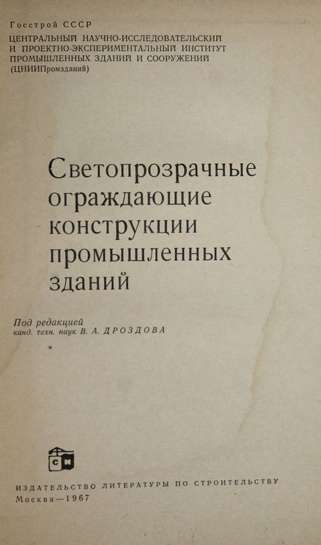 Светопрозрачные ограждающие конструкции промышленных зданий. Под редакцией В. А. Дроздова. М.: Стройиздат. 1967г. 252 с., ил. Данные о применении светопрозрачных конструкций из стекла и пластмасс для естественного освещения промзданий. Физико-технические характеристики материалов. Перспективные решения светопрозрачных ограждений. Конструкции, располагаемые в покрытиях промзданий. Материалы экспериментальных и теоретических исследований конструкций. Способы производства светопрозрачных элементов, технико-экономические показатели применения светопрозрачных конструкций в строительстве. Твердый переплет. Увеличенный формат. Хорошее состояние.