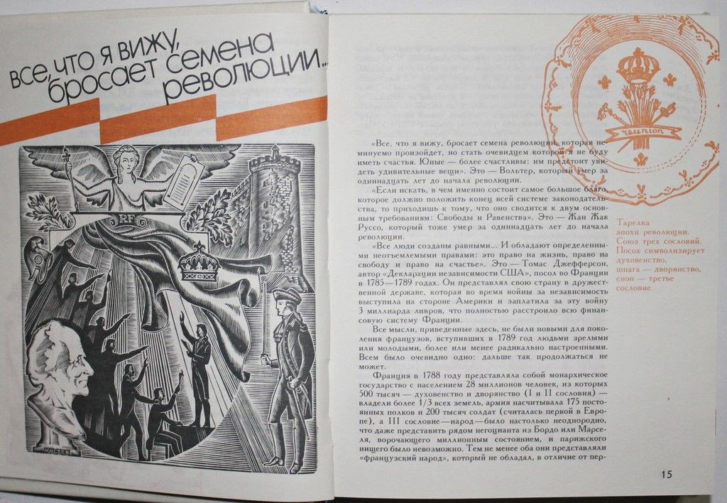 Свобода. Равенство. Братство. Великая французская революция: Документы, письма, речи, воспоминания, песни, стихи.(Люди. Время. Идеи). Составили: О.В.Кустова и И.Н.Коротков. Л.: Детская литература, 1989. – 463 с., ил. Твердый издательский переплет. Уменьшенный формат, 16.5х13 см. Книга посвящена событиям Великой Французской революции и ее деятелям. Особый интерес представляет оригинальное оформление, иллюстрации, виньетки, заставки и пр. размещены практически на каждом листе, гравюры, портреты деятелей революции. Любопытные подробности биографий, отрывки публикаций общественно-политических взглядов, речей, песни и стихи периода 1789-1793 годов и прочие революционно-исторические материалы. Очень хорошее состояние.