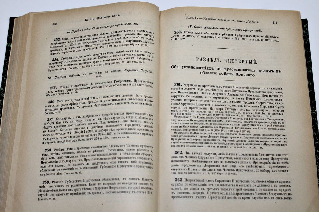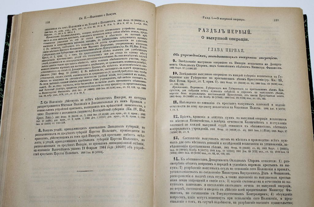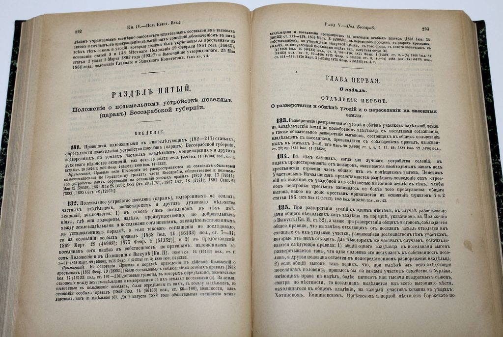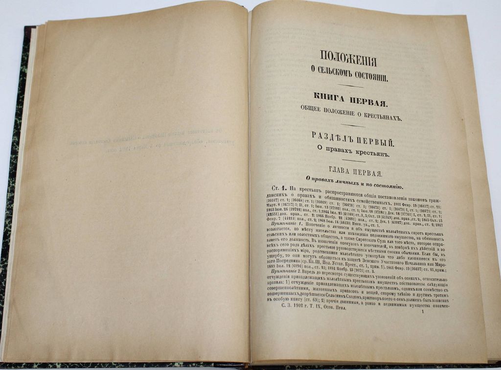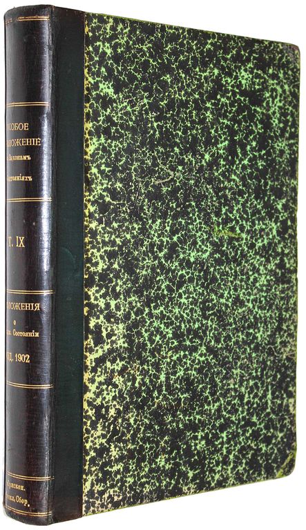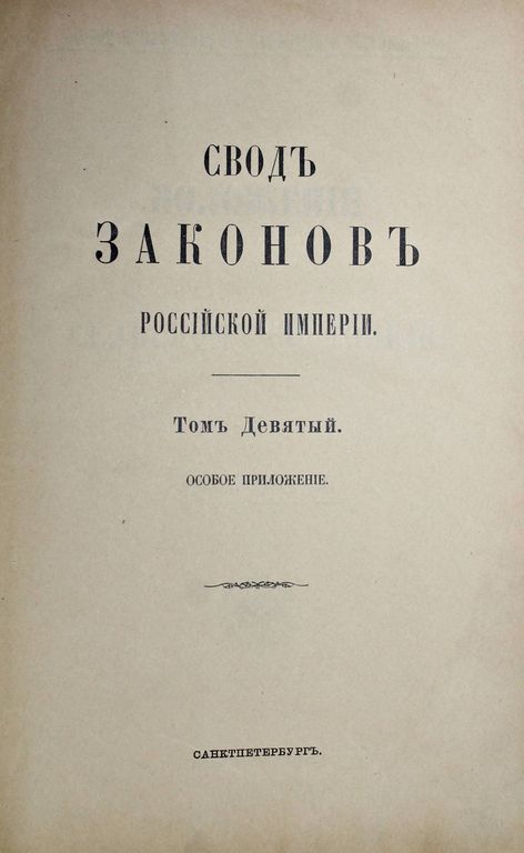 Свод Законов Российской Империи, повелением Государя Императора Николая Первого составленный. Том 9: Особое приложение о состояниях. Положения о сельском состоянии. СПб.: Государственная типография, 1902. – [8], 768 с., табл. Полукожаный переплет с золотым тиснением на корешке. Энциклопедический формат, 26.5х18.5 см. Очень хорошее состояние.
