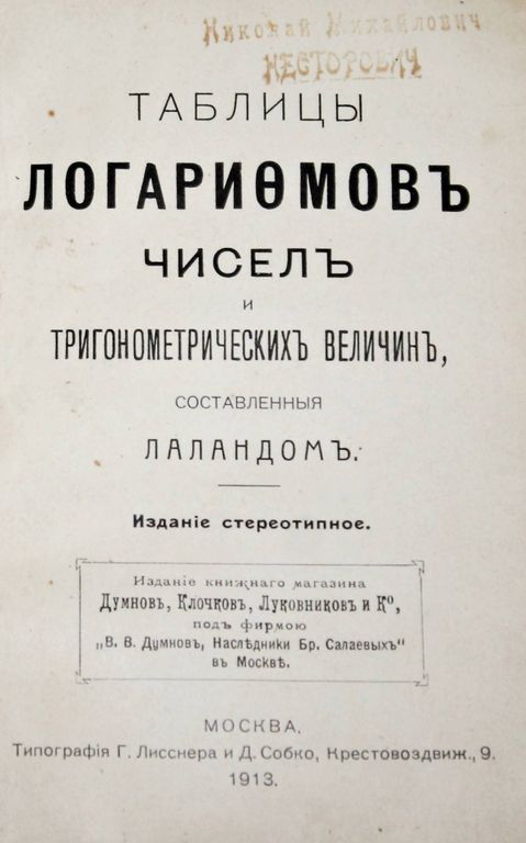 Таблицы логарифмов чисел и тригонометрических величин, составленные Лаландом. М.: Типография Г.Лисснера и Д.Собко, 1913. – 205 с. Бумажная обложка. Уменьшенный формат, 13.5х9 см. Из библиотеки Н.М.Нестеровича (1891 – 1956) – русский, советский математик, доктор наук. Хорошее состояние. Без задней стороны обложки, экслибрис.