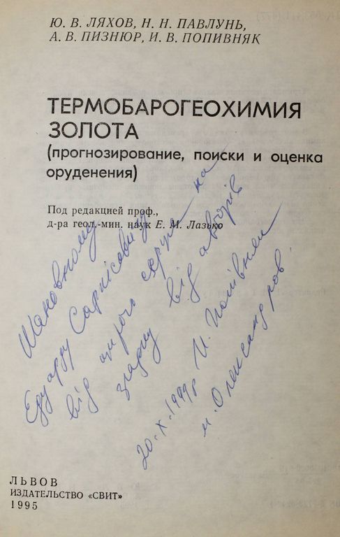 Ляхов Ю. В. и др. Термобарогеохимия золота. Львов: Свит. 1995г. 1300 руб. В корзину Описание Описание Ляхов Ю. В. и др. Термобарогеохимия золота. Прогнозирование, поиски и оценка оруденения. Львов: Свит. 1995г. 280 с. Твердый переплет. Обычный формат. Отличное состояние. Дарствен. одного из соавторов. Вас также может заинтересоватьВ корзинуУшаков К.М. Управление школой: кризис в период реформ. М.: Сентябрь. 2011.150 ₽ В корзину