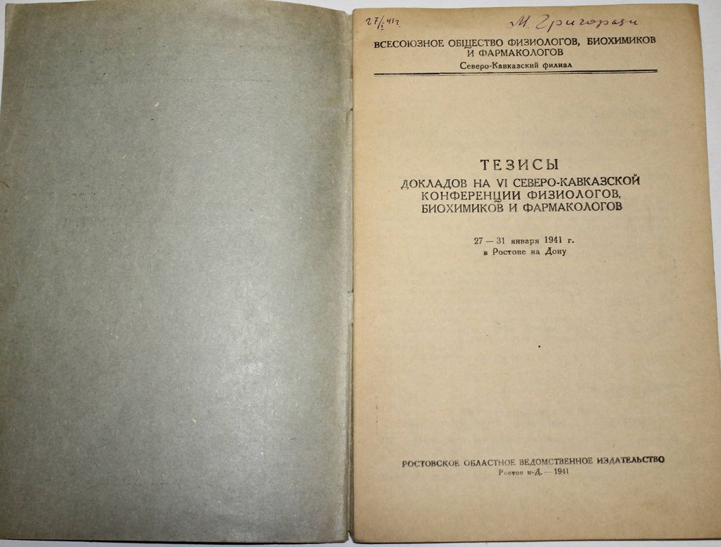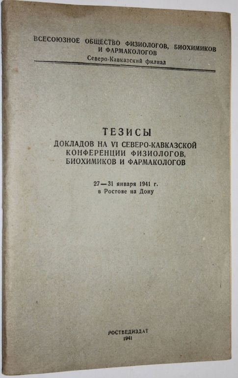 Тезисы докладов на VI Северо-Кавказской конференции физиологов, биохимиков и фармакологов 27 – 31 января 1941 г. в Ростове-на-Дону. Ростов-н/Д: Ростведиздат, 1941. – 35 с. В мягкой издательской обложке. Увеличенный формат. Тираж 300 экз. Хорошее состояние. Автограф участника конференции.