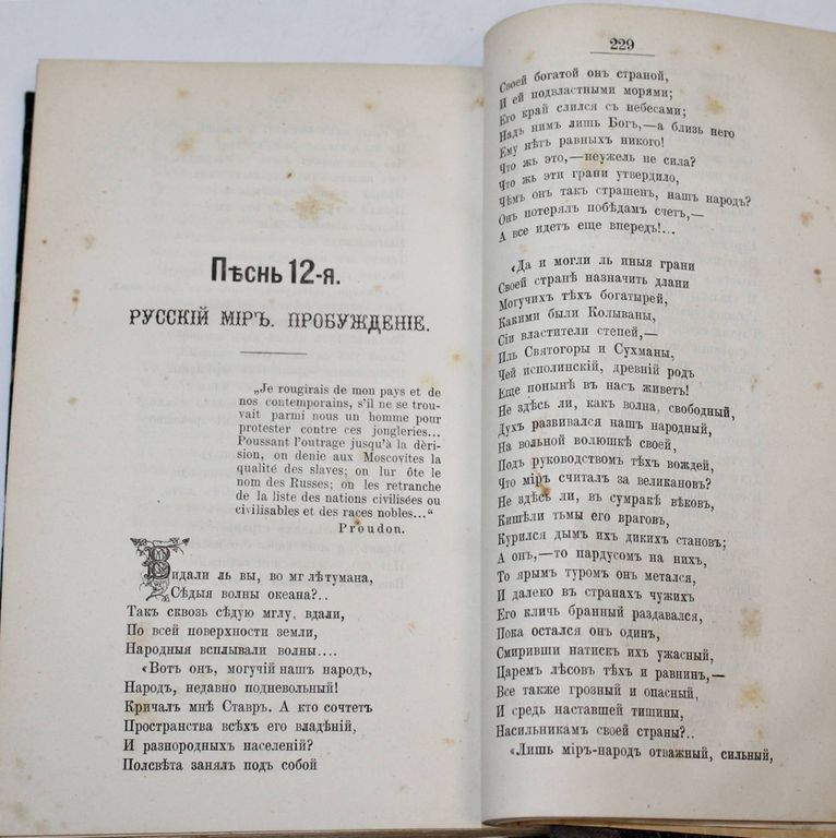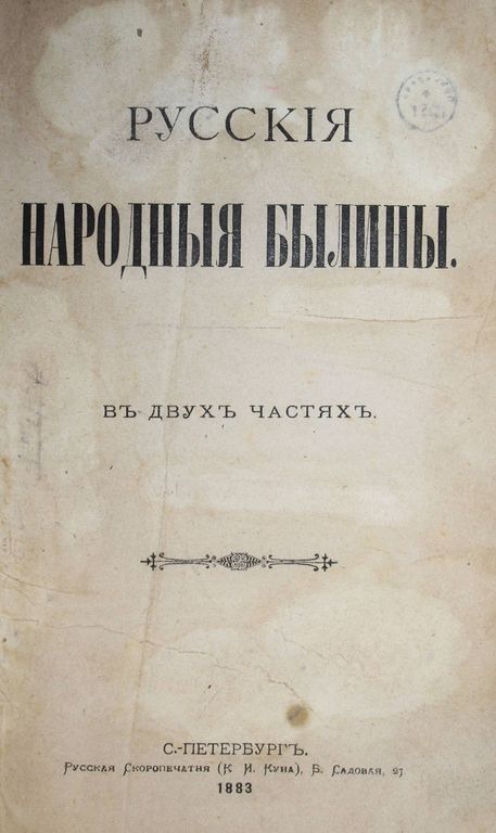 Русские народные былины. Сост. А.В.Тимофеев. [в 2-х ч.]. Книга вторая. СПб.: Русская скоропечатня (К.И.Куна), 1883. – [4], 300 с. В составном переплете. Увеличенный формат, 22.5х15 см. Алексей Васильевич Тимофеев (1812 - 1883) - русский писатель и поэт. Его поэма `Микула Селянинович, представитель земли` - удачная попытка представить в живописных картинах всю историю России и в рельефных образах дать очерк происхождения славян. Хорошее состояние. Небольшая потертость переплета, `мытые` штампы, `лисьи` пятна.
