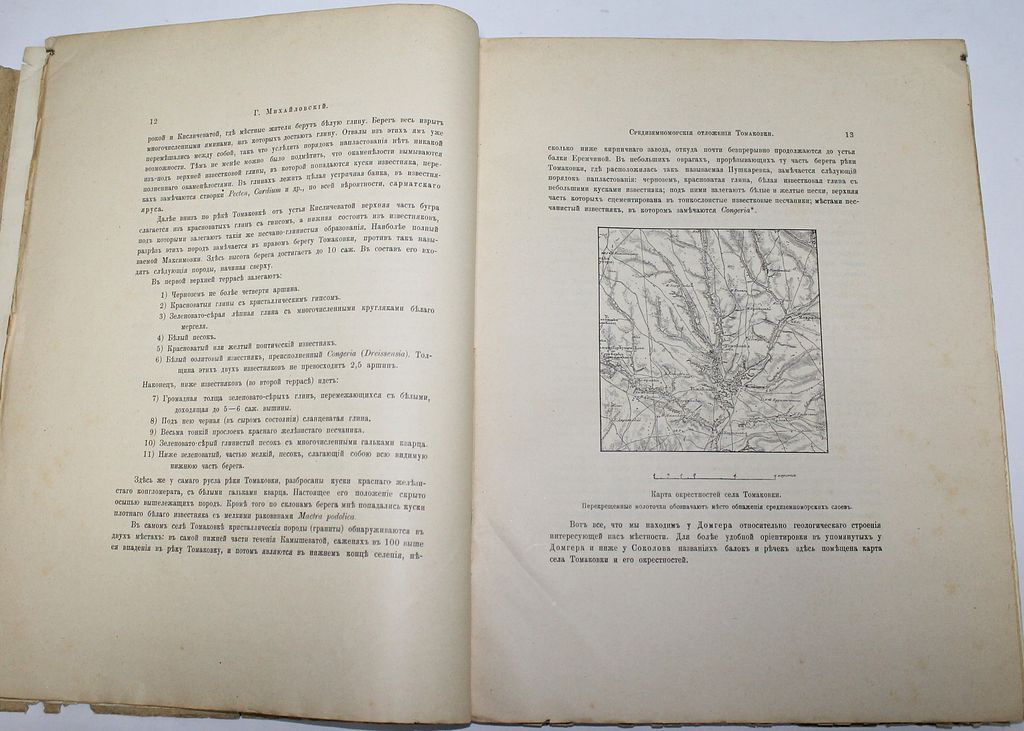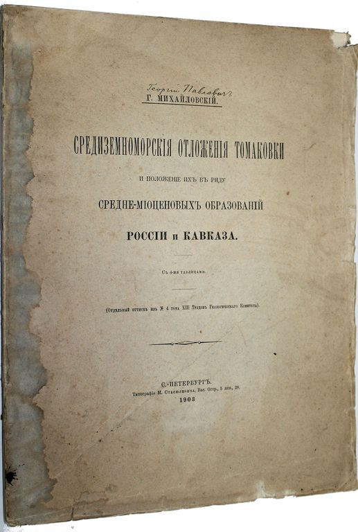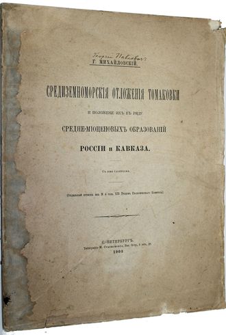 Михайловский Г. Средиземноморские отложения Томаковки и положение их в ряду средне-миоценовых образований России и Кавказа. С 4-мя таблицами. (Отдельный оттиск из № 4 тома XIII Трудов Геологического Комитета). СПб.: Типография М.Стасюлевича, 1903. – IV, 186, [8] с., ил., 4 л.табл. В шрифтовой издательской обложке. Очень большой формат, 33.5х25.5 см. Михайловский Георгий Павлович (1870 - 1913) - геолог, профессор, интересовался преимущественно палеонтологией и исторической геологией. По поручению различных ученых обществ и геологического комитета совершил ряд экскурсий по северному Уралу, югу России и Кавказу (Чечня и Абхазия). Данный труд является магистерской диссертацией Г.П. Михайловского. Хорошее состояние. Необрезанный экземпляр. небольшие надрывы обложки.