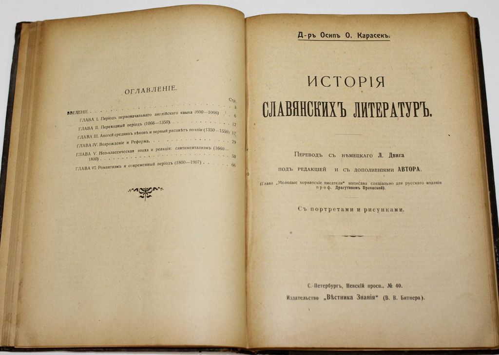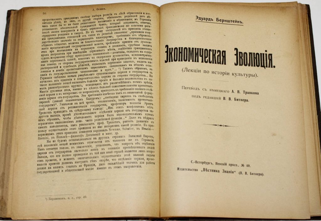 Томас В.; Карасек О.; Орлов А.; Бернштейн Э. Конволют: История английской литературы; История славянских литератур; Церковь и государство; Экономическая эволюция. СПб.: Изд. `Вестник Знания` (В.В.Битнера), 190?. – 96 с., ил.; 144 с., ил.; 36 с.; 64 с. Полукожаный переплет. Увеличенный формат, 23х16 см. Хорошее состояние. Потертость переплета, незначительные загрязнения.