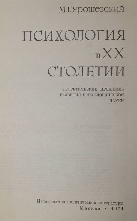 Ярошевский М.Г. Психология в ХХ столетии. Теоретические проблемы развития психологической науки. М.: Политиздат. 1971г. 368 с. Критический анализ основных направлений и школ зарубежной психологии: бихевиоризма, гештальтизма, фрейдизма и др. Характеризуются особенности развития психологии в период современной научно-технической революции, ее вклад в изучение психических процессов и путей управления ими. Твердый переплет. Обычный формат. Хорошее состояние.