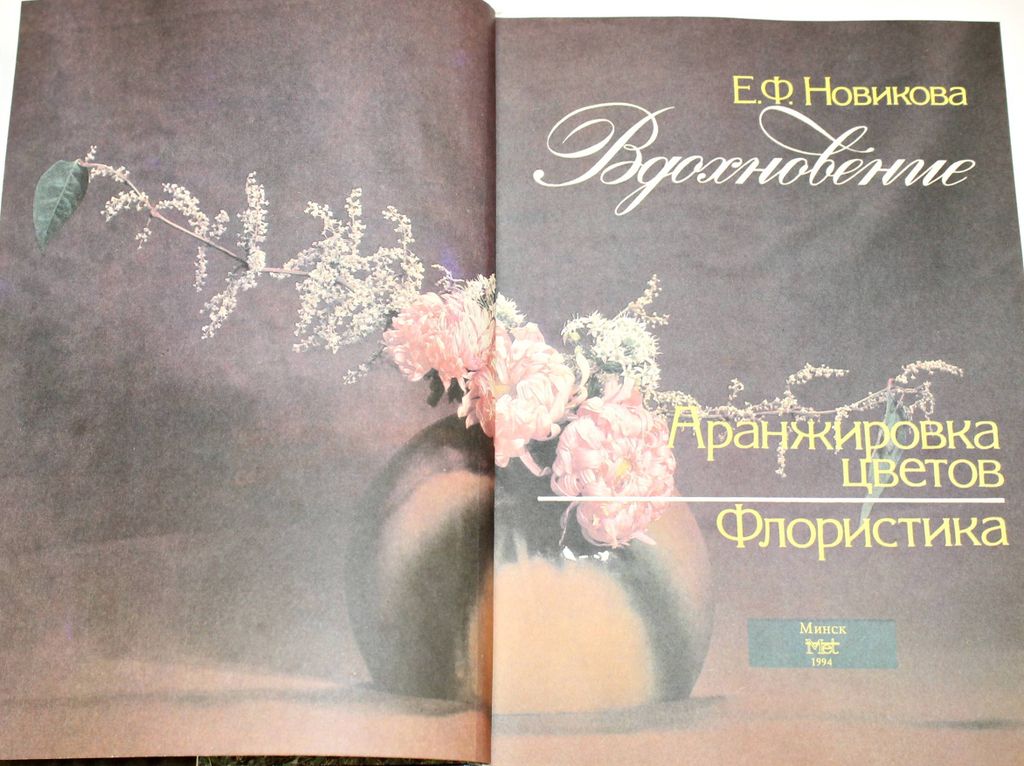 Новикова Е.Ф. Вдохновение. Аранжировка цветов. Флористика. Художник В.А.Рогалевич. Минск: МЕТ. 1994г. 438 с., ил. Предлагаемое издание является по существу книгой-альбомом, поскольку содержит цветные иллюстрации авторских работ, отражающих разные направления данной темы. Кроме того в книге есть разделы о языке цветов, о продлении жизни срезанных цветов, о выгонке растений, о цветах в легендах и поэзии. Твердый переплет. Энциклопедический формат. Хорошее состояние, небольш. загрязн. стр,,дарствен. надп.