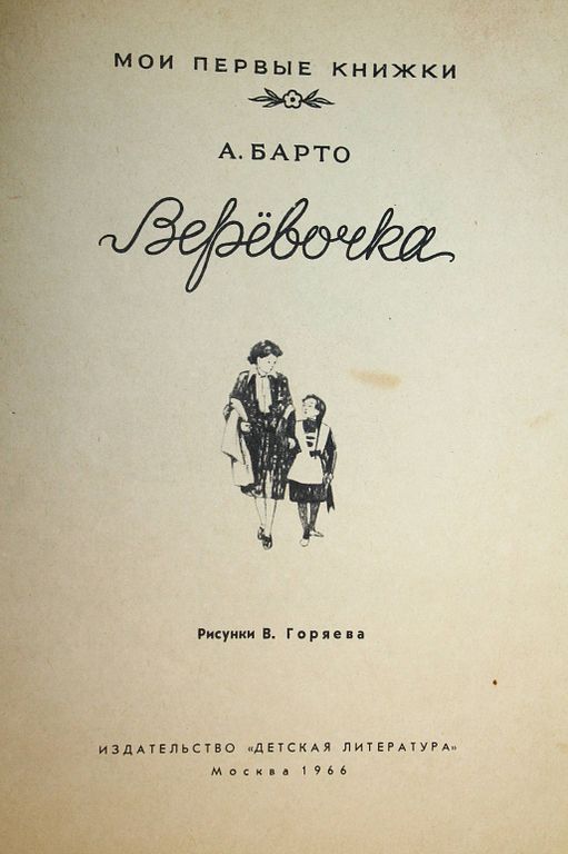 Барто А. Веревочка. М.: Детская литература. 1966г. 250 руб. В корзину Описание Описание Барто А. Веревочка. Стихи. Художник В. Горяев. М.: Детская литература. 1966г. 16 с.,ил. Мягкий переплет. Обычный формат. Уд. состояние. Вас также может заинтересоватьВ корзинуБарсамов Н. Иван Константинович Айвазовский. М.: Знание. 1967г.130 ₽ В корзину