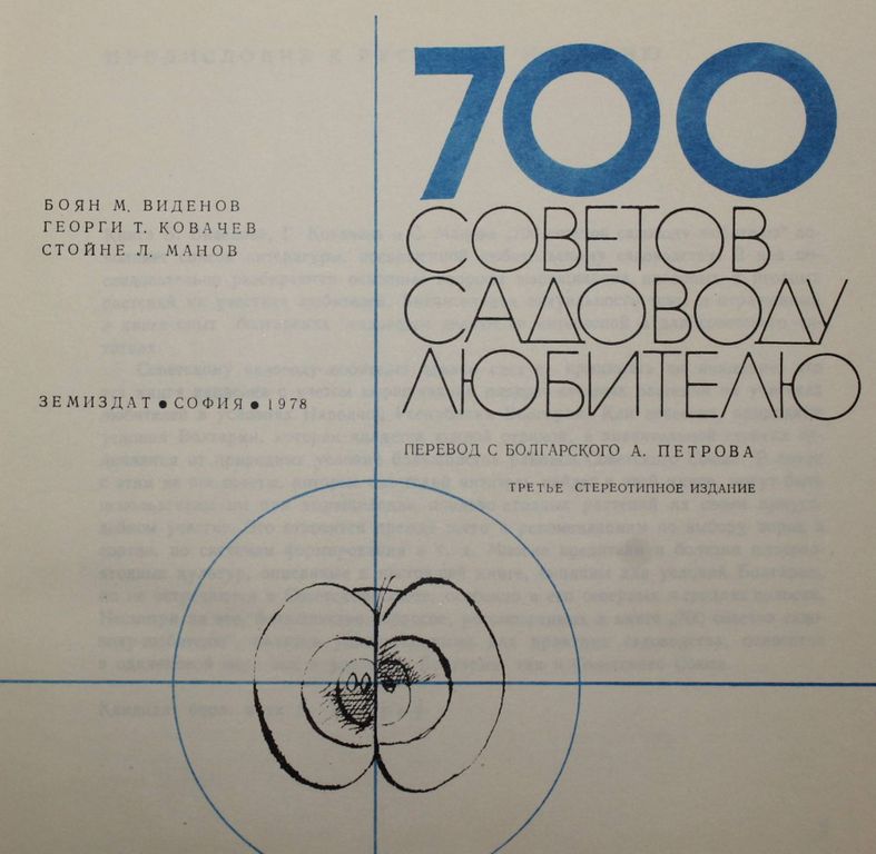 Виденов Б.,Ковачев Г.,Манов С. 700 советов садоводу-любителю. София: Земиздат. 1978г. 415с. 700 советов в оригинальной форме дают ответы на вопросы по выбору сортов, посадке, удобрению, орошению, обрезке, борьбе с вредителями и болезнями. Советы даны сообразно условиям любительских садов, которые в значительной степени отличаются от условий и промышленных плодовых насаждениях. Каждый садовод, желающей не допускать ошибок при выращивании плодовых и ягодных растений и получить удовлетворение от своего труда, может найти ответ на интересующие его вопросы в этой книге. Книга содержит многочисленные иллюстрации. Твердый переплет. Суперобложка. Обычный формат. Хорошее состояние, супер. с надр.