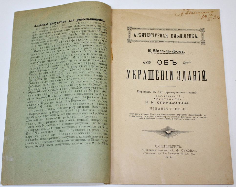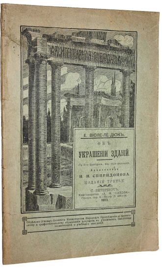 Виоле-ле-Дюк Э.Э. Об украшении зданий. Пер. с 3-го фр. изд. под ред. Н.Н. Спиридонова. Серия: `Архитектурная библиотека`. СПб.: Книгоиздательство `А.Ф. Сухова`, 1913. – 88 с., ил. Иллюстрированная издательская обложка. Энциклопедический формат, 26х17 см. Эжен Эмманюэль Виолле-ле-Дюк (1814-1879) – французский архитектор, реставратор, искусствовед и историк архитектуры, идеолог неоготики, основоположник архитектурной реставрации. Хорошее состояние. Владельческая подпись на титуле.