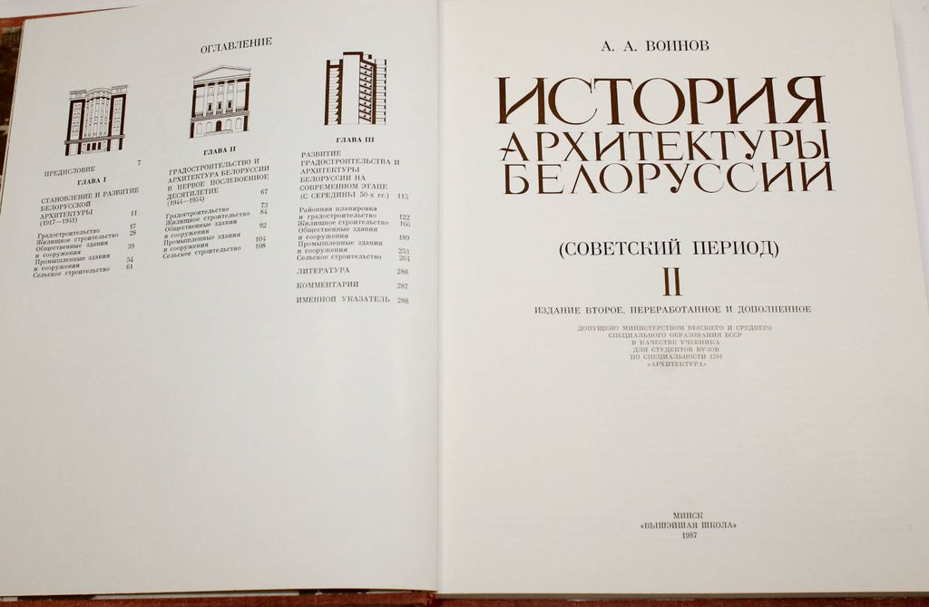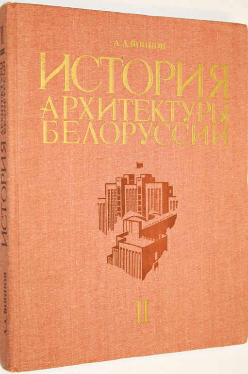 Воинов А.А. История архитектуры Белоруссии. В 2-х томах. Том 2 (Советский период). Минск: Выш. школа. 1987. 293с.,ил. В книге белорусского архитектора и историка архитектуры освещается путь, пройденный архитектурой Белорусской ССР с 1917 по середину 1980-х гг. По сравнению с 1-м изданием, вышедшим в 1975 г., книга кардинально переработана, размещено множество новых уникальных иллюстраций и планов. Твердый переплет. Энциклопедический формат. Хорошее состояние.