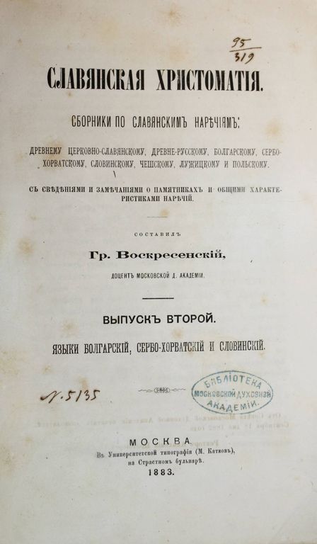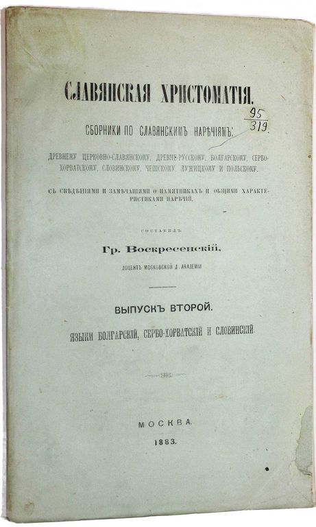 Воскресенский Г. Славянская хрестоматия. [в 3-х вып.]. Вып.2: языки болгарский, сербо-хорватский и словинский. М.: В Университетской тип., 1883. – [2], III, 292, IV, [2] с. В шрифтовой издательской обложке. Увеличенный формат, 24х15 см. Григорий Александрович Воскресенский (1849 - 1918) - русский богослов, филолог-славист, специалист по истории библейских переводов; ординарный профессор Московской духовной академии по кафедре русского и церковно-славянского языков с палеографией и историей русской литературы. Прижизненное издание. Хорошее состояние. Небольшие потертости обложки, штамп `Московской духовной академии`.