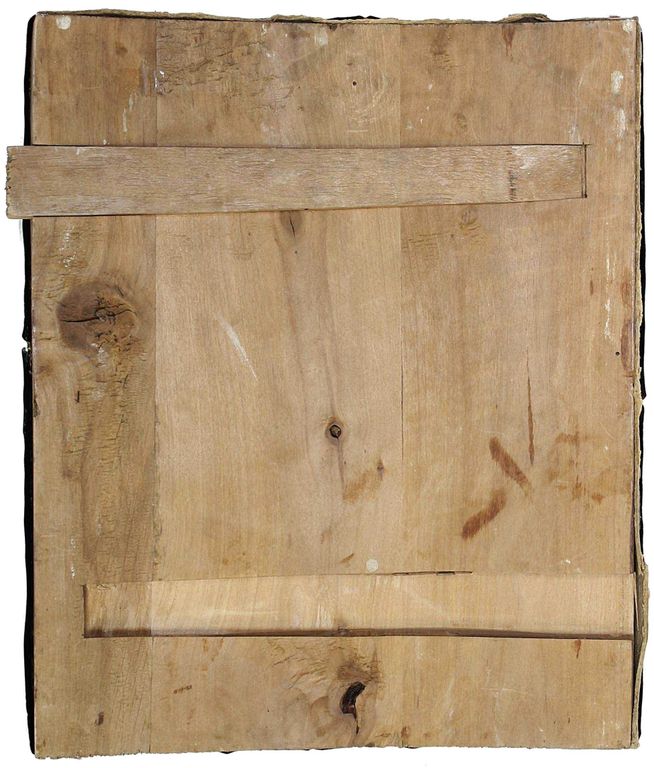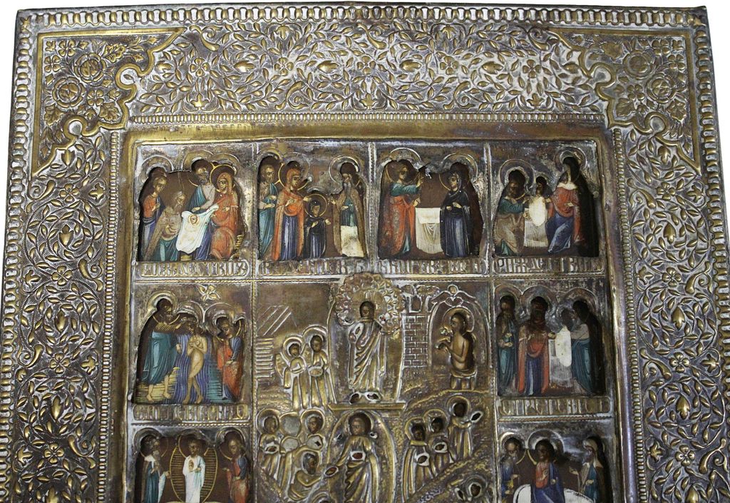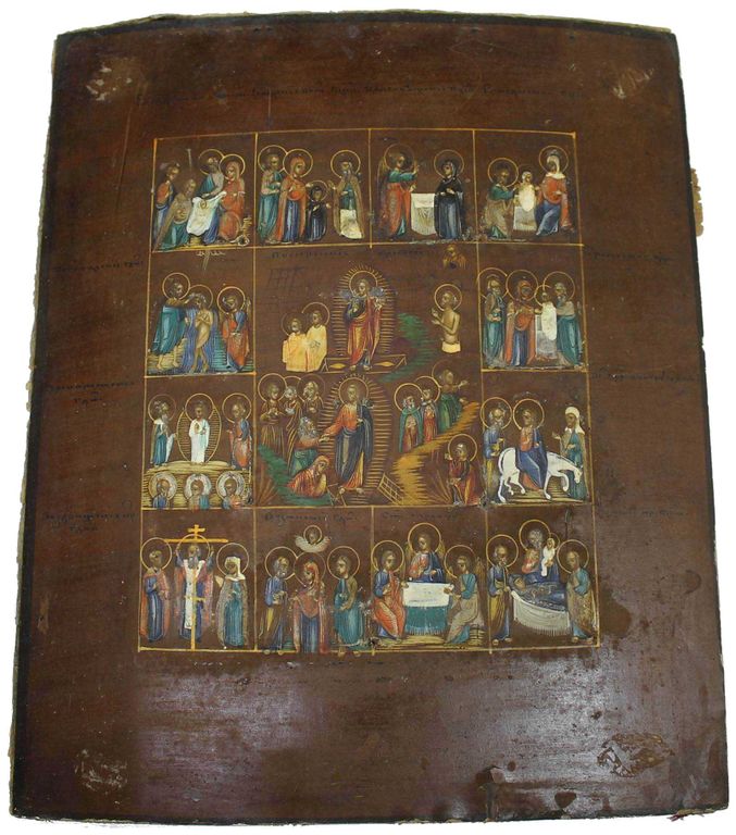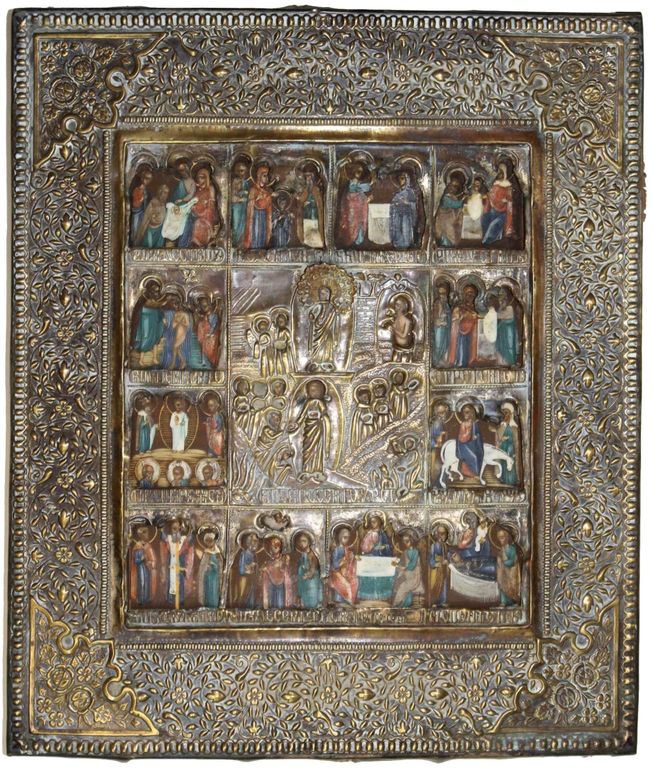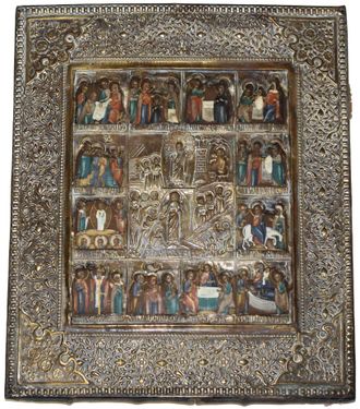 Икона `Воскресение Христово - сошествие в ад` с 12 клеймами двунадесятых праздников. Россия. XIX век. Дерево, левкас, темпера, мелочное письмо. Размер: 31.5 х 26.5 см. Латунный оклад, (не закреплен к доске). Встречные шпонки (одна утрачена). Хорошее состояние. Незначительные повреждения красочного слоя и левкаса от крепления оклада, следы бытования.