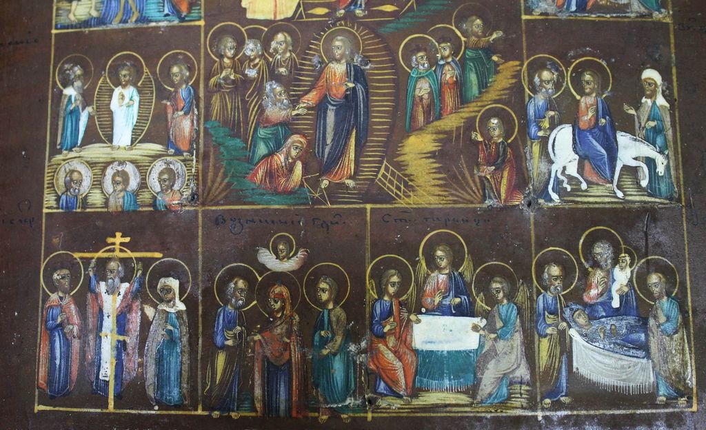 Подобная композиция - расположение праздников в клеймах по сторонам от центрального изображения, известна на Руси со второй половины XVI в. А широкое распространение получила уже в XVII столетии. Главная идея и центральная композиция иконы посвящены триумфальной победе Христа над смертью.