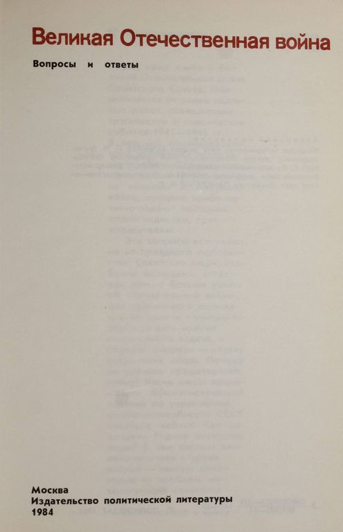 Великая Отечественная война. Вопросы и ответы. М.: Политиздат. 1984г. 430 с.,ил. Эта книга - рассказ о подвиге советского народа в годы Великой Отечественной войны. Построенная в форме вопросов и ответов на них, она ярко раскрывает всемирно-историческое значение нашей победы, принесшей народам всей планеты долгожданный мир. Твердый переплет. Увеличенный формат. Хорошее состояние.