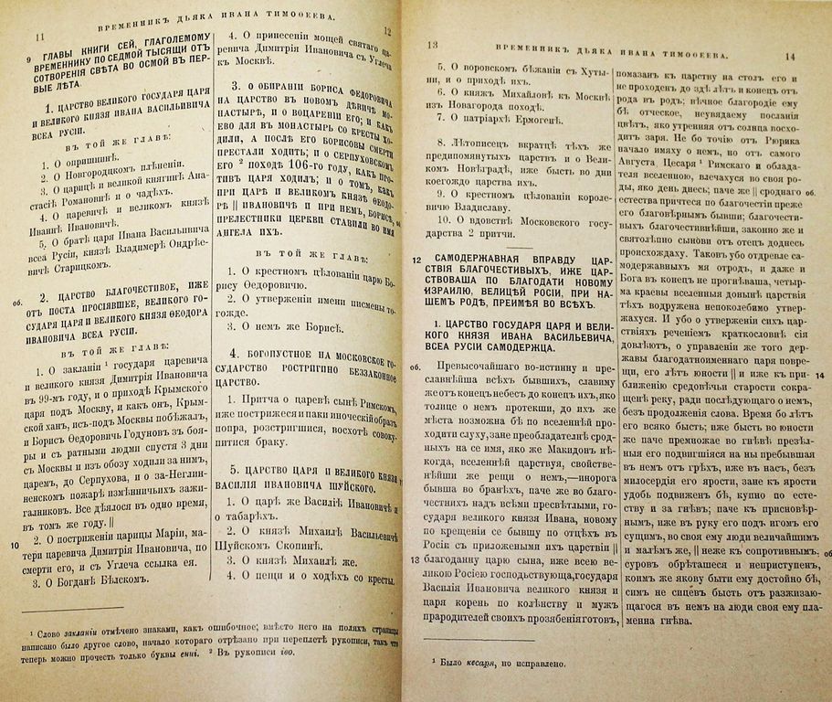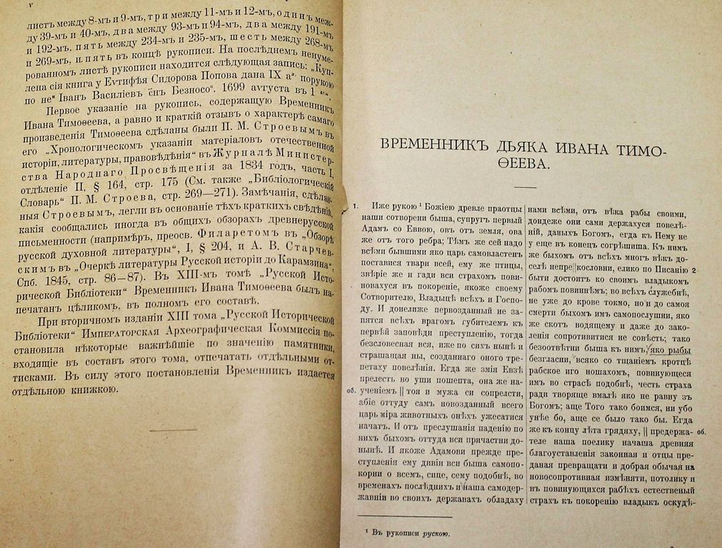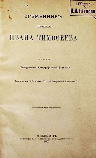 Временник дьяка Ивана Тимофеева. Издание Императорской Археографической Комиссии (Извлечено из XIII-го тома `Русской Исторической Библиотеки`). СПб.: Типография М.А.Александрова, 1907. – V, 6 -215 с. Владельческий картонажный переплет. Энциклопедический формат, 27х18.5 см. Иван Тимофеев сын Семенов (ок. 1555 - 1631) - русский дьяк, государственный деятель, писатель, религиозно-философский мыслитель.. Уже среди современников Иван Тимофеев почитался как `книгочтец и временных книг писец`. `Временник` дьяка Ивана Тимофеева - один из крупнейших литературно-философских памятников начала XVII века, дошедший до нас в единственной рукописи. Хорошее состояние. Экслибрис личной библиотеки, инвентарная отметка.