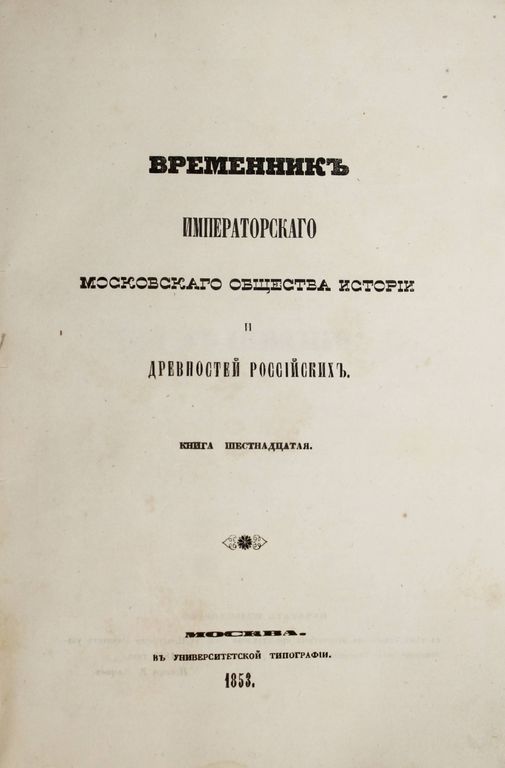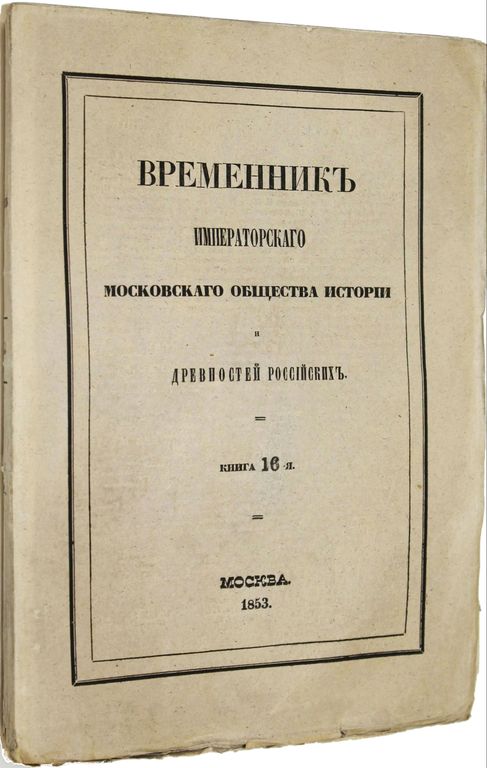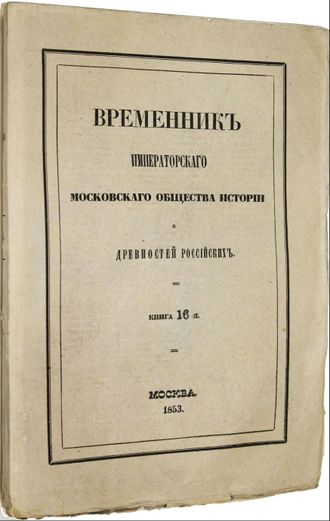 Временник Императорского Московского общества истории и древностей российских. Книга 16-я. М.: В Университетской Типографии, 1853. – [4], 102, 46, [2], VI, 146, [2], 68, II с., 2 л. ил. В шрифтовой издательской обложке. Энциклопедический формат, 25.5х18 см. `Московское общество истории и древностей Российских` - первое научное историческое общество в Российской империи для изучения и публикации документов по русской истории. Общество было основано в 1804 году при Московском университете по инициативе Шлёцера. В него вошли преподаватели университета, а также историки, архивисты и археографы (Н. М. Карамзин, Н. Н. Бантыш-Каменский, А. Ф. Малиновский, К. Ф. Калайдович, А. И. Мусин-Пушкин и др.). Активная деятельность МОИДР продолжалась до конца 1918 года. Хорошее состояние. Необрезанный экземпляр.