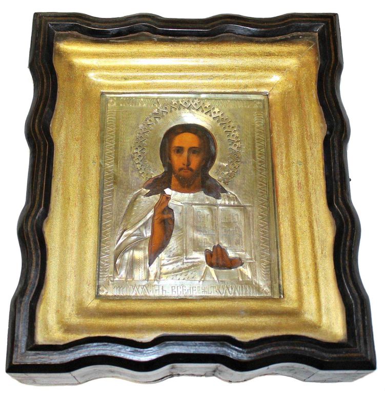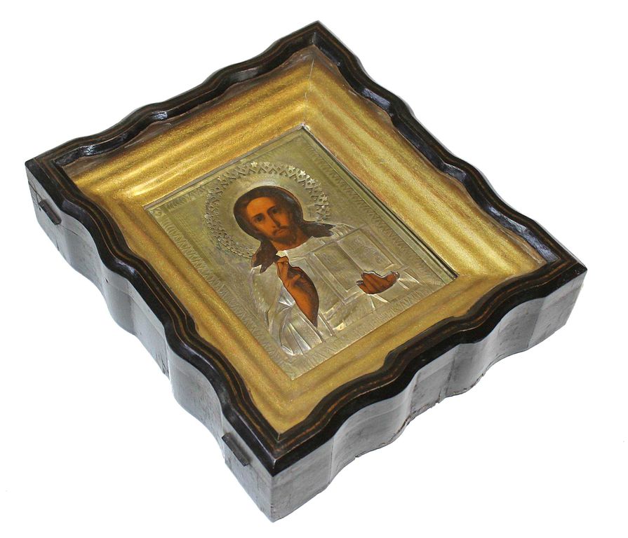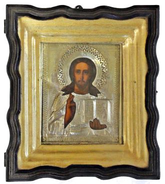 Икона `Господь Вседержитель` в латунном окладе и киоте. Россия. Дерево, масло. Размер: 17.2 х 13.7 см. Оклад: латунь, чеканка, гравировка, штихель. Деревянный киот, рама, стекло. Размер киота: 27.5х24 см. Кон. XIX – нач. ХХ века. В хорошей сохранности, следы бытования.