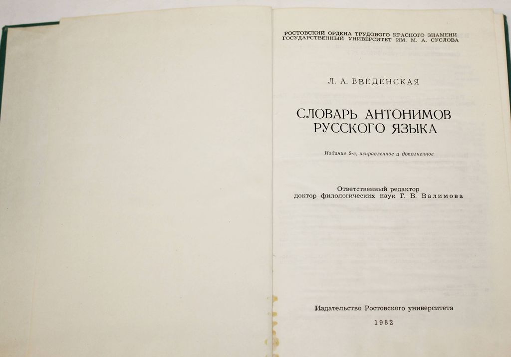 Введенская Л.А. Словарь антонимов русского языка. Ростов-на –Дону: РУ 1982г. 200 руб. В корзину Описание Описание Введенская Л.А. Словарь антонимов русского языка. Ростов-на –Дону: РУ 1982г. 176с. Твердый переплет. Обычный формат. Хорошее состояние. Вас также может заинтересоватьВ корзинуЛокшина С.М. Краткий словарь иностранных слов. М.: Русский язык. 1977г.120 ₽ В корзину