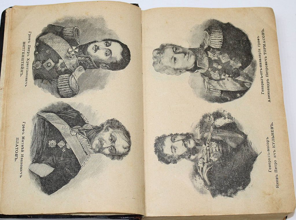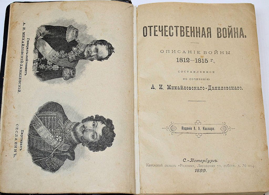 Михайловский-Данилевский А.И. Герои Отечественной войны. Описание войны 1812-1815 г. Сост. по соч. А.И.Михайловского-Данилевского. [В 2 ч.]. СПб.: Изд. А.А.Каспари; Тип. журн. `Родина`, 1899. – Ч.1: [2], 512 c., 7 л. ил.; Ч.2: 513-720 с. Полукожаный переплет. Обычный формат, 20.5х14 см. Александр Иванович Михайловский-Данилевский (1789-1848) - генерал-лейтенант, военный историк; во время войны 1812 г. был адъютантом Кутузова. Хорошее состояние. Небольшая потертость переплета.