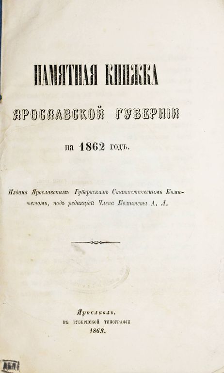 Памятная книжка Ярославской губернии на 1862 год. Издана Ярославским Губернским статистическим комитетом. Под ред. члена комитета А.Л. Ярославль: Губернская типография, 1863. – [6], 43, 128, 476, [2] с. В немой бумажной обложке. Увеличенный формат, 24х16 см. Памятные книжки губерний и областей Российской империи - официальные универсальные справочные издания, сообщающие сведения о губернии (области) за определенный год. Издаваемые сравнительно небольшими тиражами и распространяемые преимущественно в пределах своей губернии или области, памятные книжки становились библиографической редкостью почти с самого момента своего выхода в свет. Хорошее состояние. Необрезанный экземпляр. Несколько дореволюционных штампов.