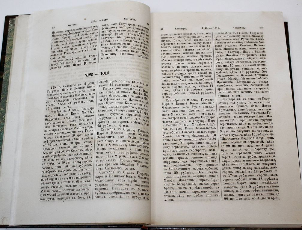 Забелин И. Дополнения к дворцовым разрядам по поручению графа Дмитрия Николаевича Блудова собранные из книг и столбцов прежде бывших дворцовых приказов архива оружейной палаты Иваном Забелиным. Часть первая. Издание Императорского Общества Истории и Древностей Российских при Московском Университете. М.: Университетская тип., 1882. – XV, 912 стлб. В современном полукожаном переплете. Энциклопедический формат, 25.5х18 см. Содержанием `Дворцовых разрядов` или `повседневных дворцовых записок` были отметки о местах службы бояр во время выходов государевых, царских походов из Москвы, приема послов и других придворных церемоний. `Дополнениями` к дворцовым разрядам служили выписи из приходо-расходных книг, содержавшие подробности о дарах, поднесенных государю, и о лицах, бывших у него при всех приемах и приездах иностранных послов. Те и другие представляют богатый материал для русской генеалогии. Впервые часть дворцовых разрядов, с 1632 по 1655 г., под заглавием `Повседневные дворцовые записки` была издана в Москве в 1769 г. В 1850—53 г. изданы четыре тома `Дворцовых разрядов`; в `Чтениях Московского общ. истории и древн. росс.` за 1882 и 1883 гг. напечатаны и `Дополнения к Дворцовым разряда` под ред. И. Е. Забелина. Хорошее состояние. Инвентарная отметка, следы залития на отдельных листах.