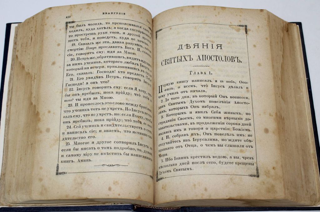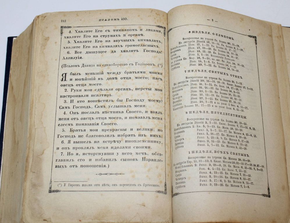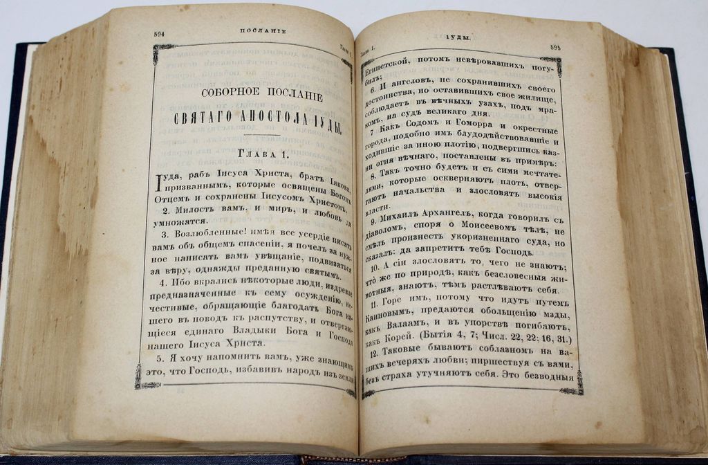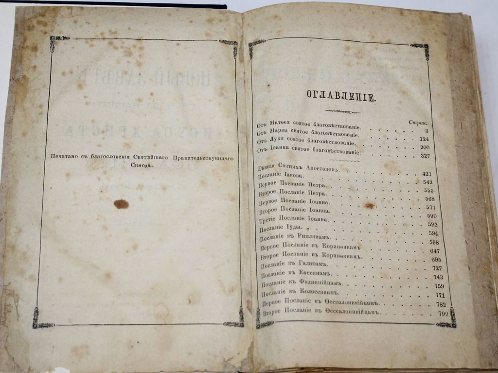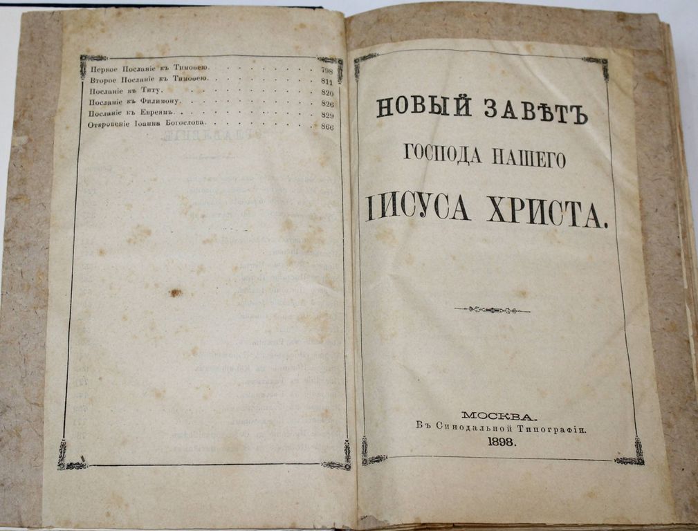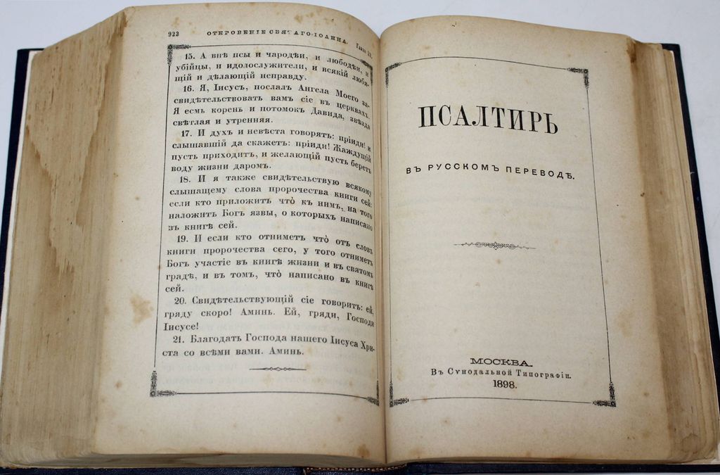 Новый Завет Господа нашего Иисуса Христа и Псалтирь в русском переводе. СПб.: Синодальная тип., 1898. – [6], 922, 242, 18 с. Твердый владельческий переплет с блинтовым тиснением. Увеличенный формат, 23х17 см. Хорошее состояние. Реставрация полей отдельных листов, утрата с.1-2 `Указателя Евангельских и Апостольских чтений на все года`.