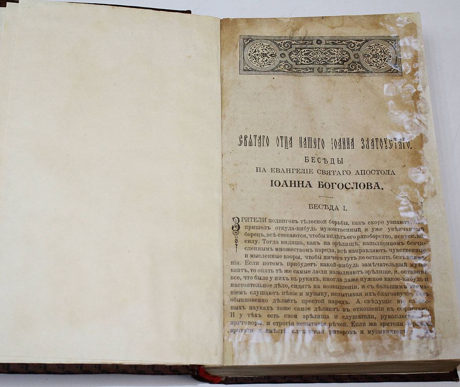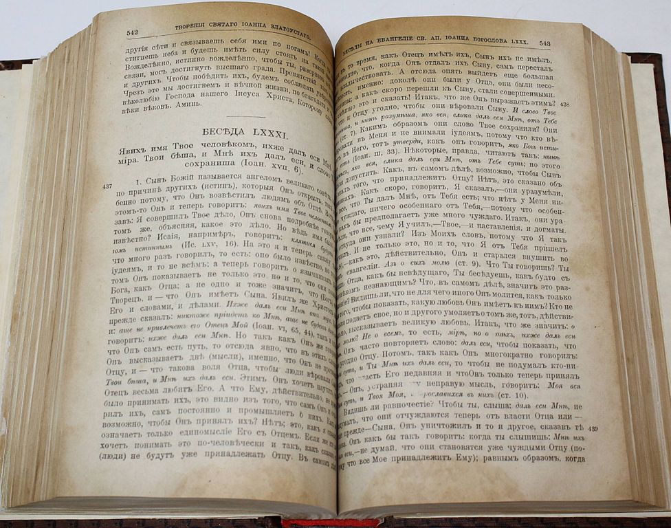 Творения Отца нашего Иоанна Златоуста, Архиепископа Константинопольского, в русском переводе. Том 8 (Книга 1 и 2). СПб.: Изд. С.-Петербургской Духовной Академии, 1902. – 1010 с. Твердый владельческий переплет. Увеличенный формат, 24х16 см. Иоанн Златоуст (ок. 347-407) - архиепископ Константинопольский, богослов, почитается как один из трех Вселенских святителей и учителей. Иоанн Златоуст - один из крупнейших и самых плодовитых христианских авторов, произведения которого широко почитаются во всем христианском мире. Удовлетворительное состояние. Утрата тит. листа, реставрация отдельных страниц.