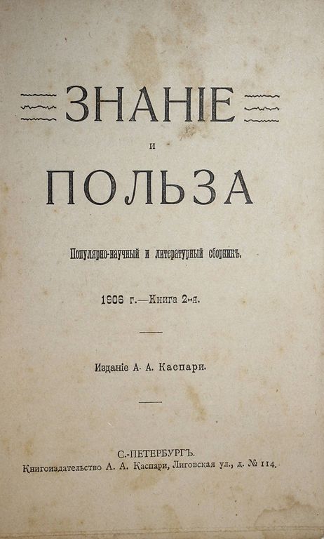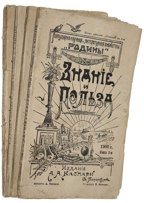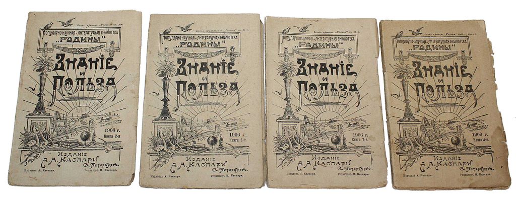 Знание и польза. Популярно-научный и литературный сборник. Книга 2, 6, 7 и 11 за 1906 г. СПб.: Изд. А.А.Каспари, 1906. – 112 с.; 96 с.; 96 с.; 96 с. Мягкие издательские обложки. Обычный формат, 21х13.5 см. Хорошее состояние. Незначительные дефекты обложек.